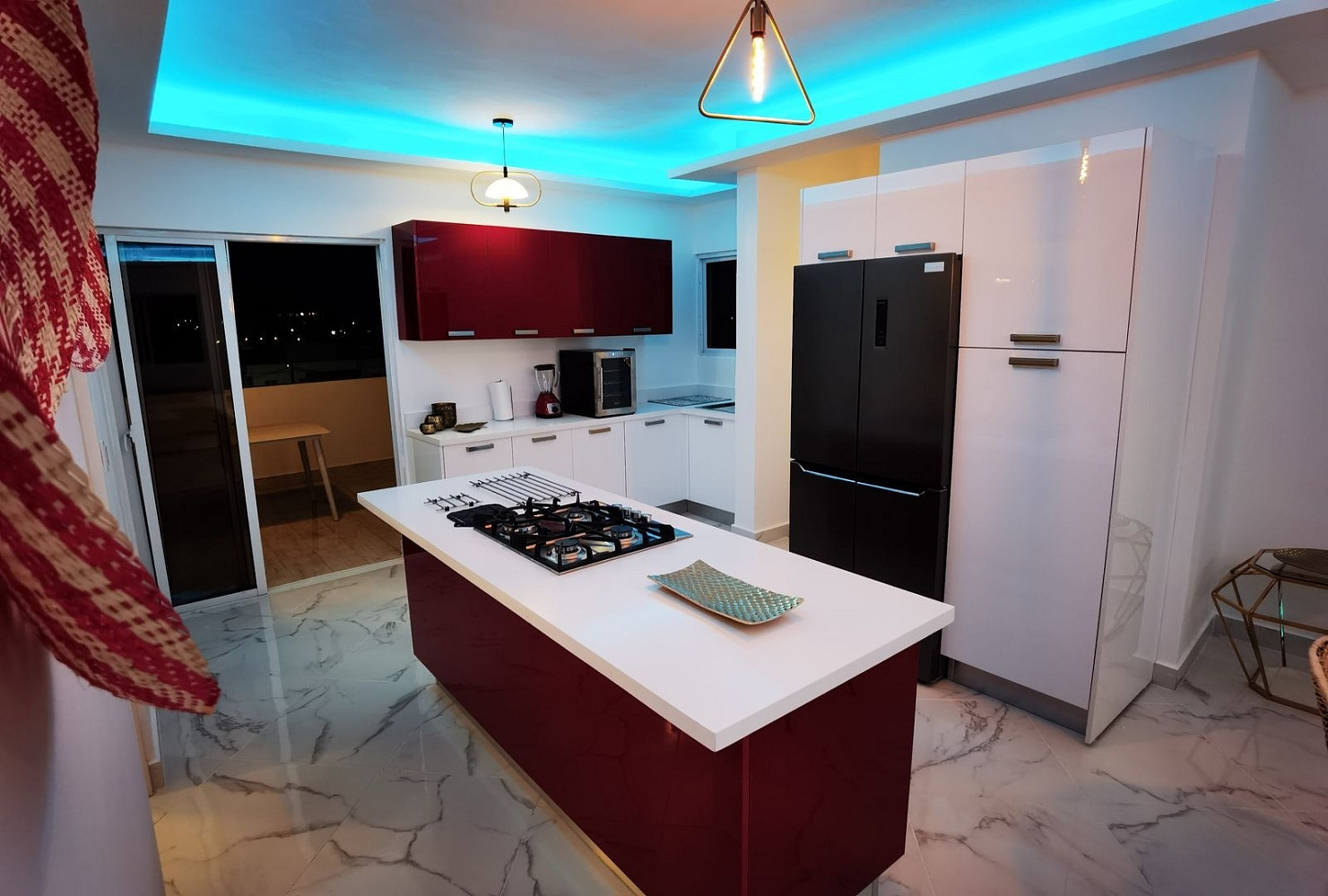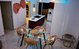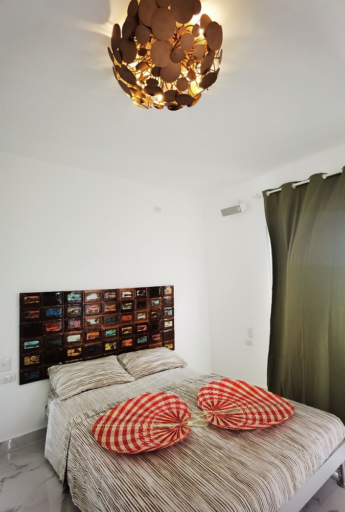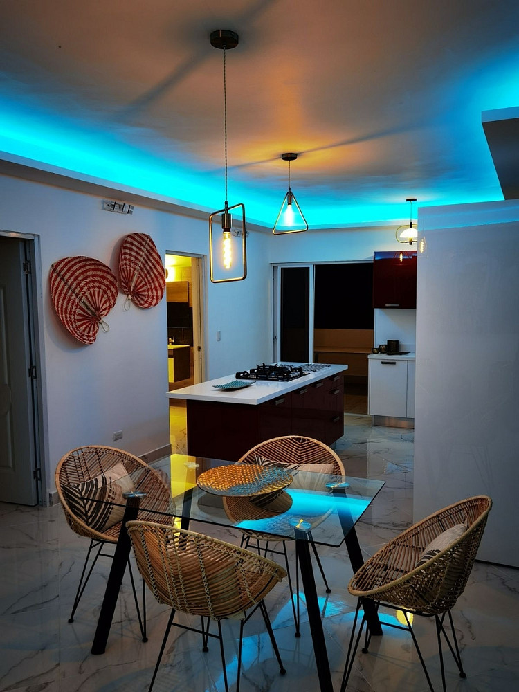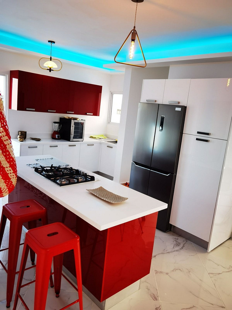 Kuchyň na míru je plně vybavena moderními spotřebiči a designovým nábytkem, díky čemuž je nejen funkční, ale také stylovým centrem celého prostoru. Celý byt se prodává kompletně zařízený tak, jak ho vidíte na fotografiích – včetně pečlivě vybraného nábytku, textilií a doplňků, které dokonale ladí s karibskou atmosférou.