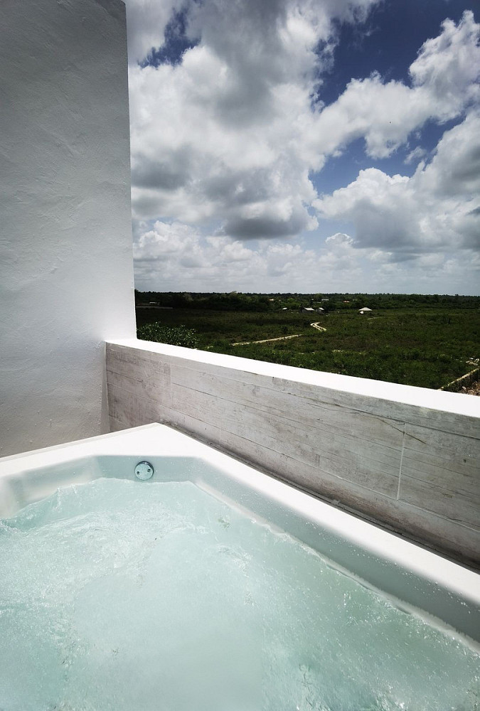 Hned při vstupu vás přivítá světlý a vzdušný interiér s důrazem na moderní design a kvalitní materiály. Dominantou tohoto apartmánu je velkorysá terasa s privátním spa, kde si můžete dopřát odpočinek pod palmami nebo večerní relax při západu slunce – v absolutním soukromí a komfortu.