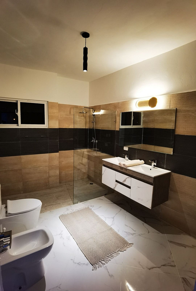 Koupelna je navržena pro maximální pohodlí – s mramorovou podlahou, stylovým vybavením a praktickým bidetem, což podtrhuje celkový dojem luxusu a kvality.