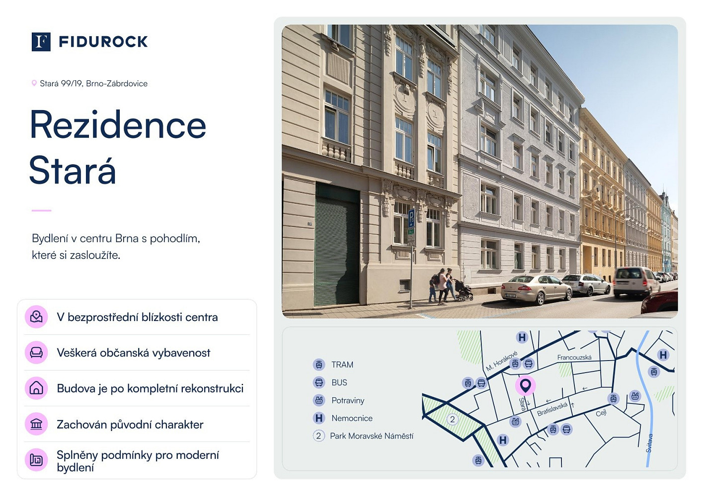 Jedna z nejžádanějších adres v centru Brna – klidná ulice Stará se nachází jen pár minut chůze od náměstí Svobody, hlavního nádraží, nebo OC Vaňkovka.