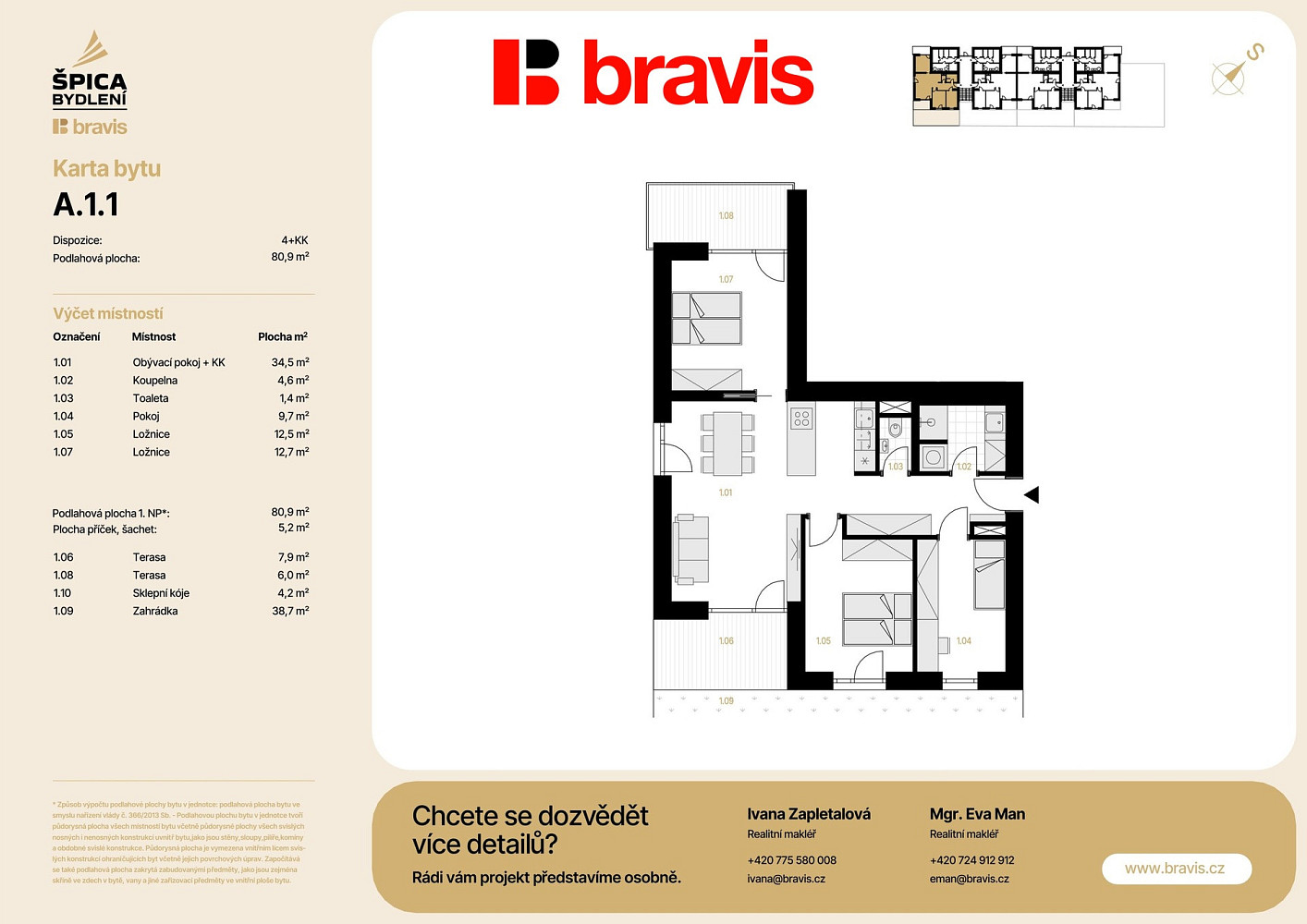 Nabízíme exkluzivní bytovou jednotku 4+kk (bytová jednotka A1-1) v novém projektu Špica bydlení — byt umístěný v přízemí nízkoenergetického bytového domu A. Celková podlahová plocha 80,9 m² s terasou 14 m², zahrádkou 38,7 m², sklepem 4,2 m² a vlastní parkovací stání, to vše v ceně bytu.