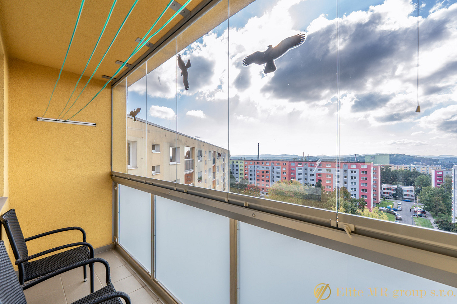 Součástí bytu je také zasklená lodžie, která poskytuje příjemné posezení s výhledem do okolí.