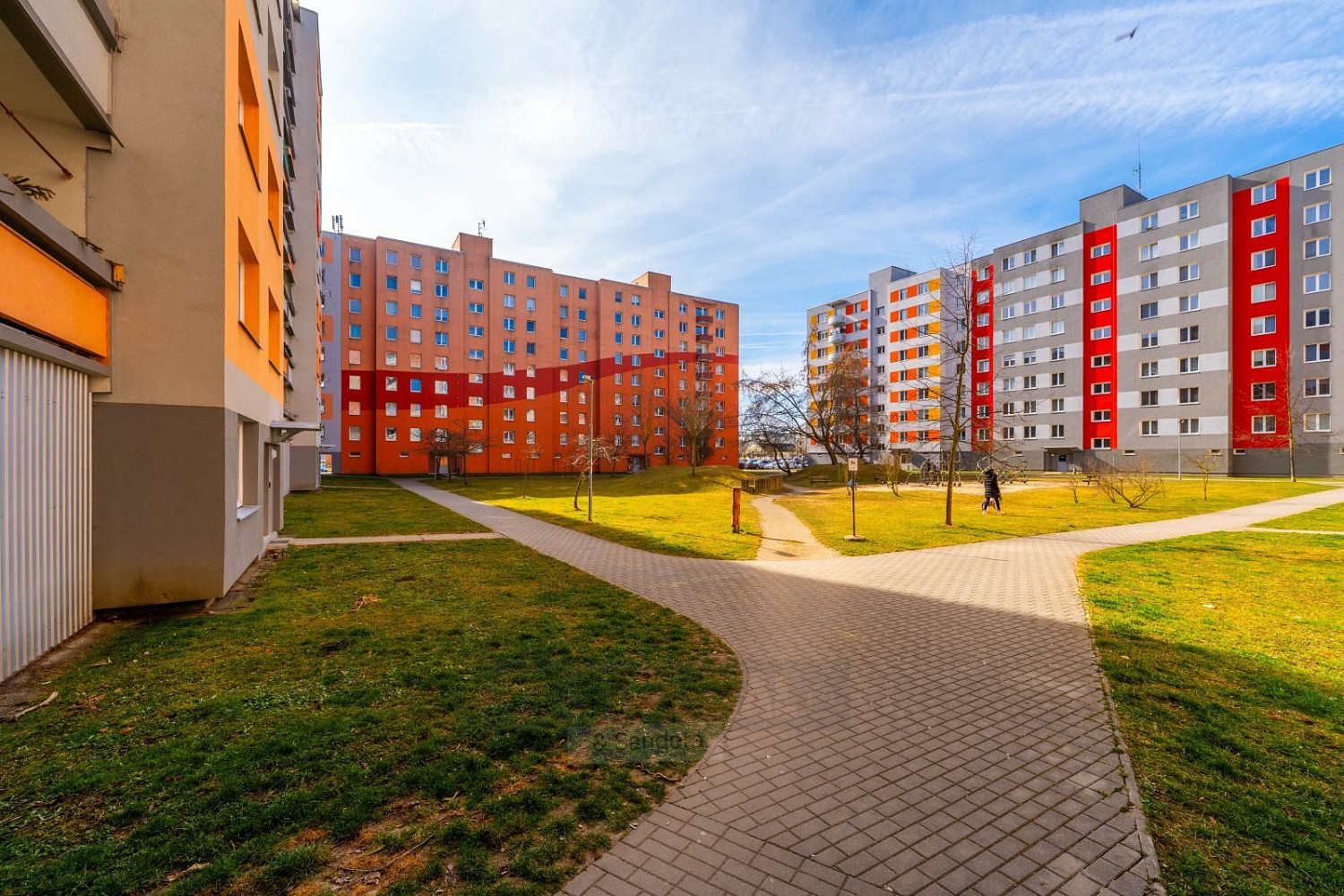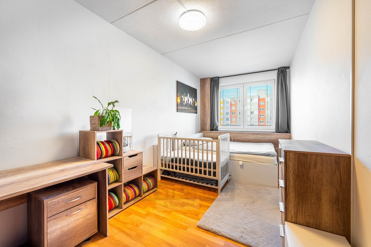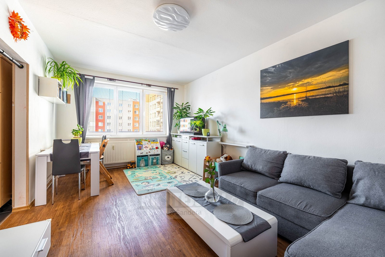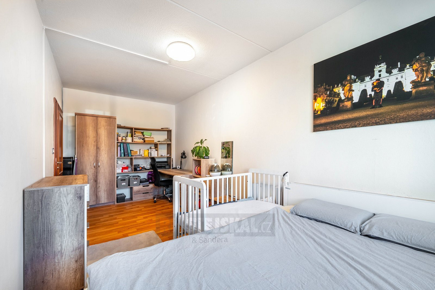 Dispozice bytu: prostorné zádveří, chodba do L s vestavěným šatním prostorem, upravené bytové jádro, samostatné WC, koupelna s vanou, umyvadlem a prostorem pro pračku, kuchyň s linkou do L a s jídelním prostorem, prostorný obývací pokoj, menší ložnice, větší obytný pokoj, veškeré pokoje samostatně přístupné, všechna okna bytu do otevřeného, klidového prostoru se zelení a dětským hřištěm, k bytu náleží sklepní kóje a možnost užívání všech společných prostor v domě,