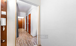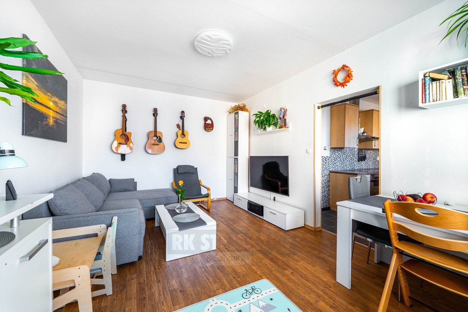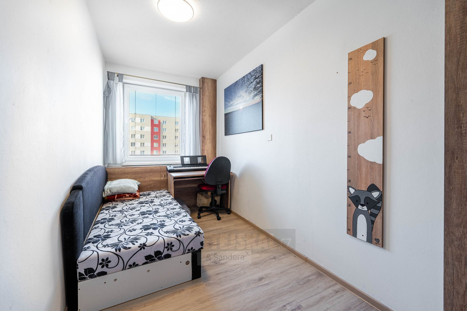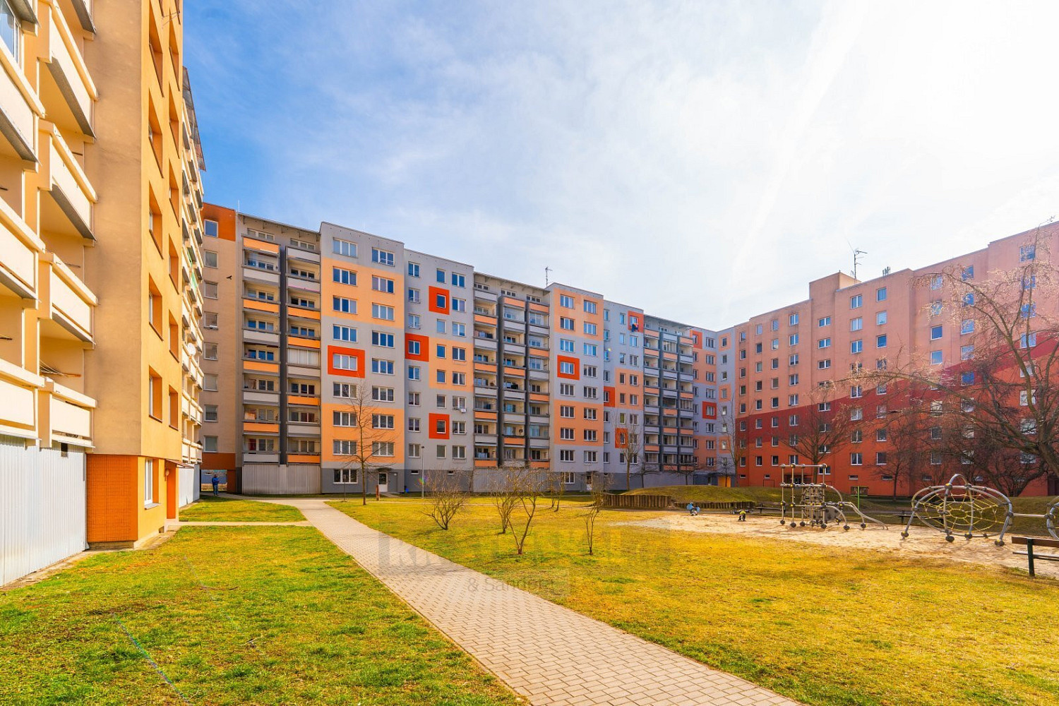 Dispozice bytu: prostorné zádveří, chodba do L s vestavěným šatním prostorem, upravené bytové jádro, samostatné WC, koupelna s vanou, umyvadlem a prostorem pro pračku, kuchyň s linkou do L a s jídelním prostorem, prostorný obývací pokoj, menší ložnice, větší obytný pokoj, veškeré pokoje samostatně přístupné, všechna okna bytu do otevřeného, klidového prostoru se zelení a dětským hřištěm, k bytu náleží sklepní kóje a možnost užívání všech společných prostor v domě,
