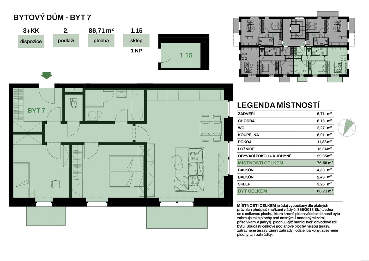 Jednotka má obytnou plochu 76,59 m² a náleží k ní 2 balkóny o výměře 4,38 m²+2,48m² a sklepní kóje 3,26m².