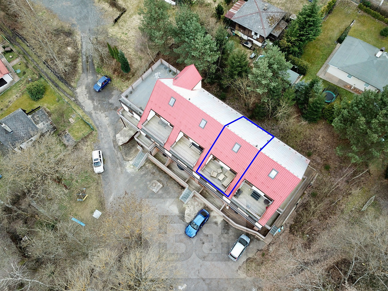 Tato konkrétní jednotka 2+kk je již kompletně vybavená, má celkovou plochu 18,79m² se spacím patrem o ploše 21,14m², s terasou o celkové ploše 14,8m² nabízející krásný výhled na okolí. K dispozici je též komora/šatna o ploše 11,57m², jež se nachází hned naproti vstupním dveří na chodbě. K jednotce přísluší parkovací stání před domem.