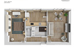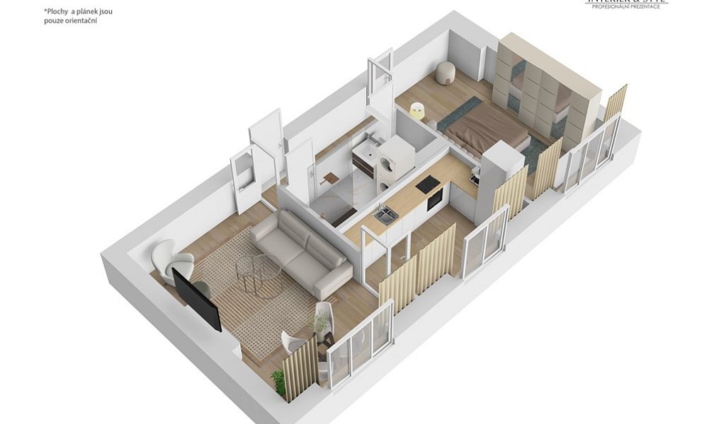 Prostor bytu je rozdělen do několika místností, které poskytují dostatek prostoru pro život jednotlivce, páru, či malé rodiny. Obývací pokoj je prostorný s velkými okny, které zajišťují dostatek denního světla. Kuchyň je praktická s možností instalace moderních spotřebičů. Samostatná ložnice poskytuje klidné místo pro odpočinek. Koupelna bude funkčně vybavena vším potřebným.