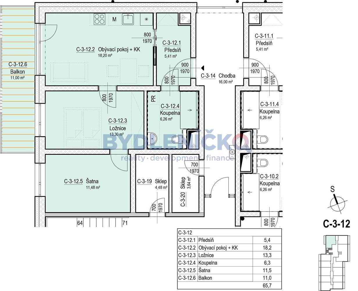 Jedná se o praktický byt o dispozici 3+kk nacházející se ve 3. NP budovy C. Stejně tak jako všechny ostatní bytové jednotky je i tato koncipována jako bezbariérová. Její podlahová plocha činí 54,7 m² a disponuje balkónem o výměře 11,0 m². Orientace bytu je na západ.