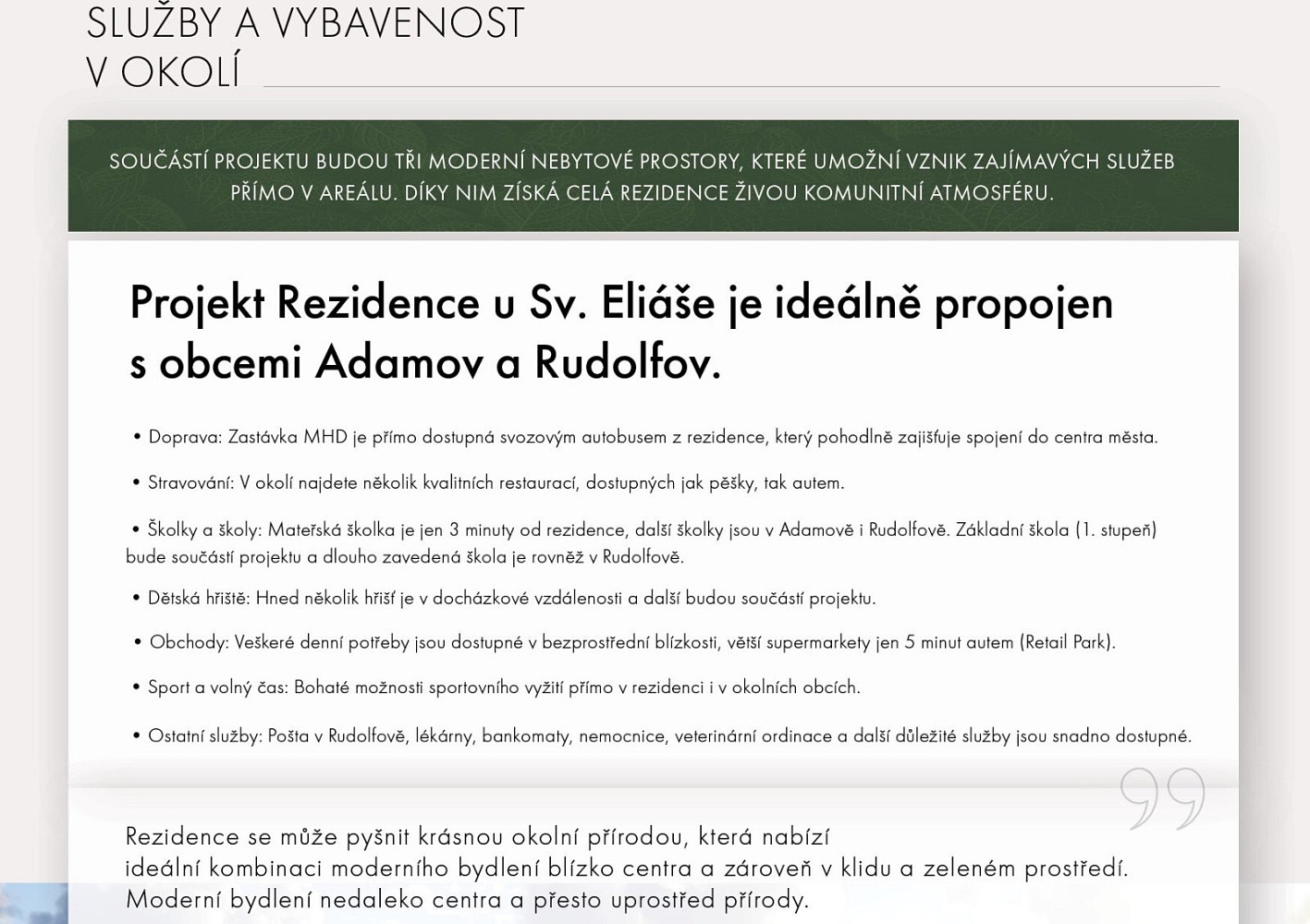 V docházkové vzdálenosti od rezidence se nachází mateřská škola, která usnadní zajištění předškolní péče. Kromě školních zařízení je součástí projektu i zdravotnické zařízení s personálem.