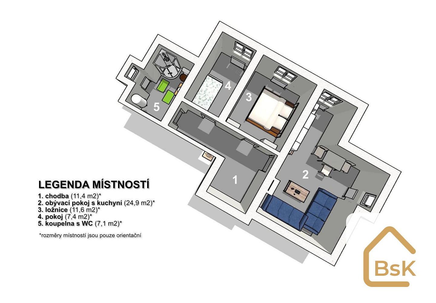 Tento byt se nachází ve 3. nadzemním podlaží kompletně rekonstruovaného bytového domu. Byt dispozičně nabízí světlý obývací pokoj s kuchyňským koutem, ložnici, dětský pokoj, samostatnou koupelnu s WC. Součástí kuchyně je vybavená kuchyňská linka V celém bytě jsou PVC podlahy. Topení zajištěno centrálním plynovým kotlem. Ohřev vody samostatným bojlerem.