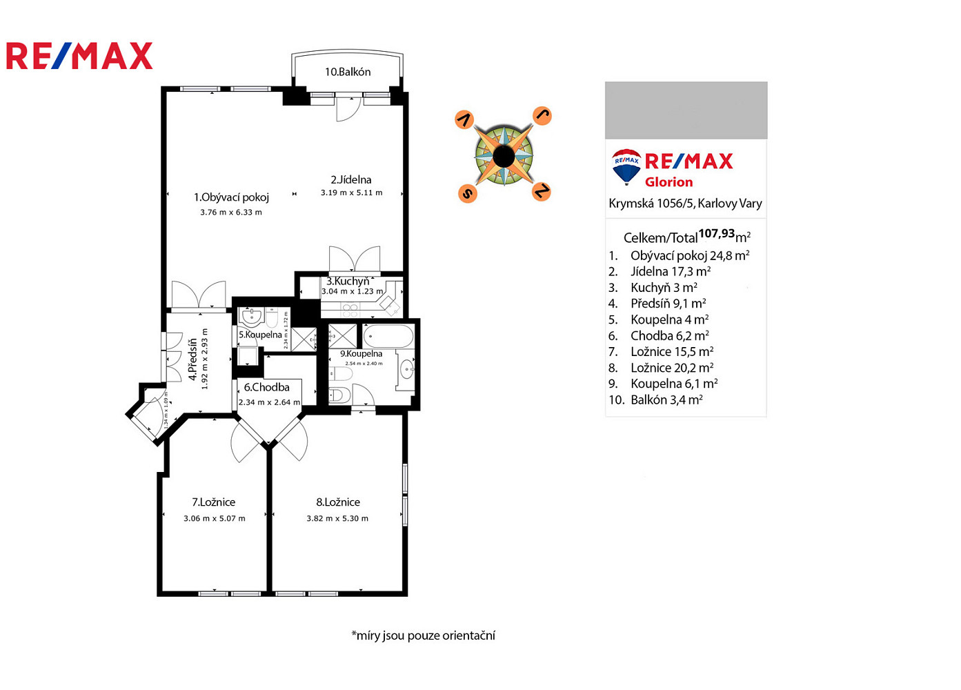 Byt má perfektní a velmi praktickou dispozici. Najdete zde dvě samostatné ložnice, prostorný obývací pokoj s kuchyňským koutem a dvě koupelny, což zajišťuje maximální komfort pro rodinu i náročnější klientelu. Celková plocha bytu činí 107,93 m².