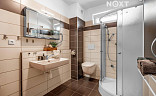 Dispozice bytu je velmi praktická: předsíň (11,3 m²), koupelna s toaletou a sprchovým koutem (6,2 m²), obývací pokoj s kuchyňským koutem (24,1 m²) a ložnice (13,9 m²). Další úložný prostor poskytují vestavěné skříně v předsíni i obývacím pokoji. K bytu patří také komora na patře (1,4 m²) a balkon (5,5 m²) orientovaný na západ, ideální pro večerní odpočinek při západu sluníčka.