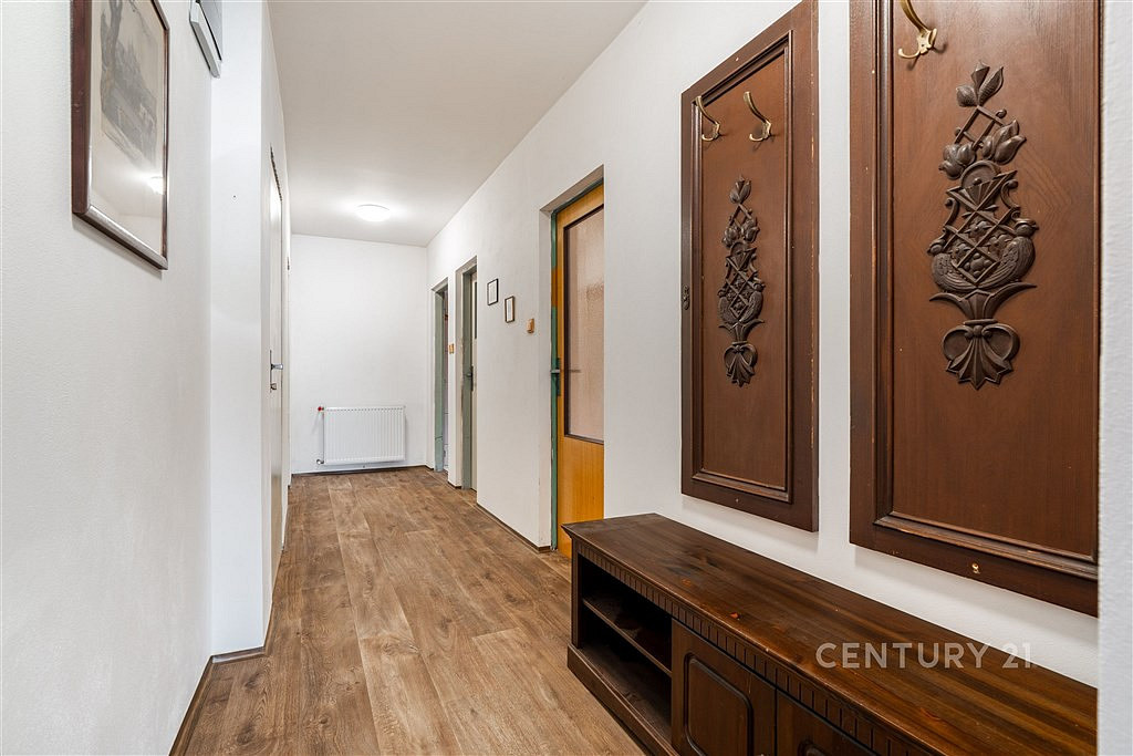 Byt je v současnosti řešen jako 4+1, tedy čtyři samostatné pokoje a kuchyň, což poskytuje dostatek prostoru i pro větší rodinu. K dispozici je dále garáž s přímým přístupem, několik skladovacích prostor, které mohou sloužit jako dílna, technické zázemí nebo pro uskladnění sezónních věcí.