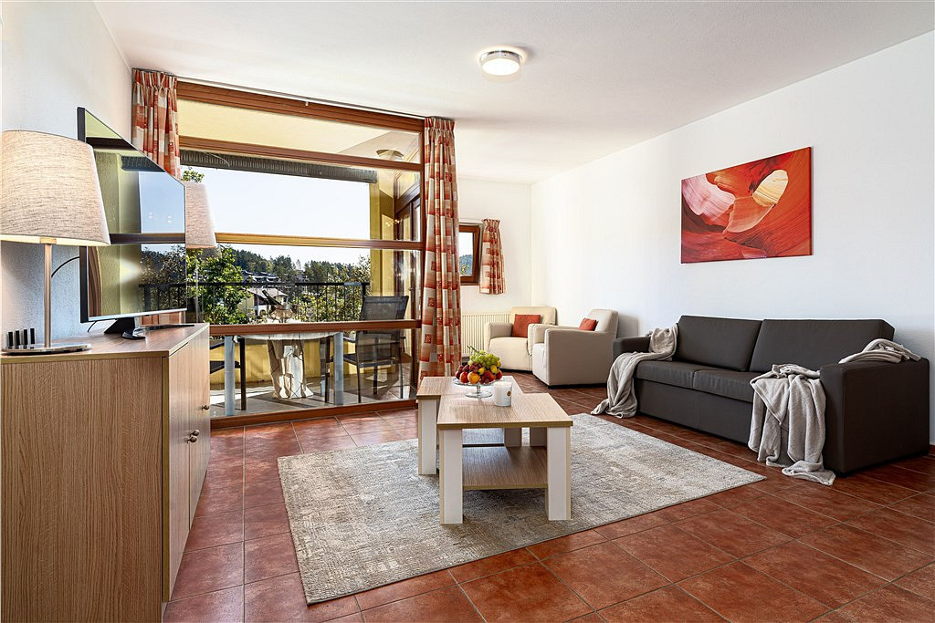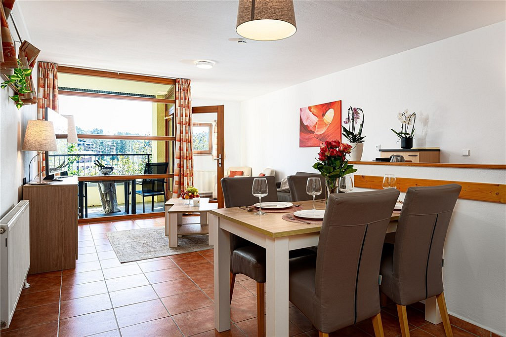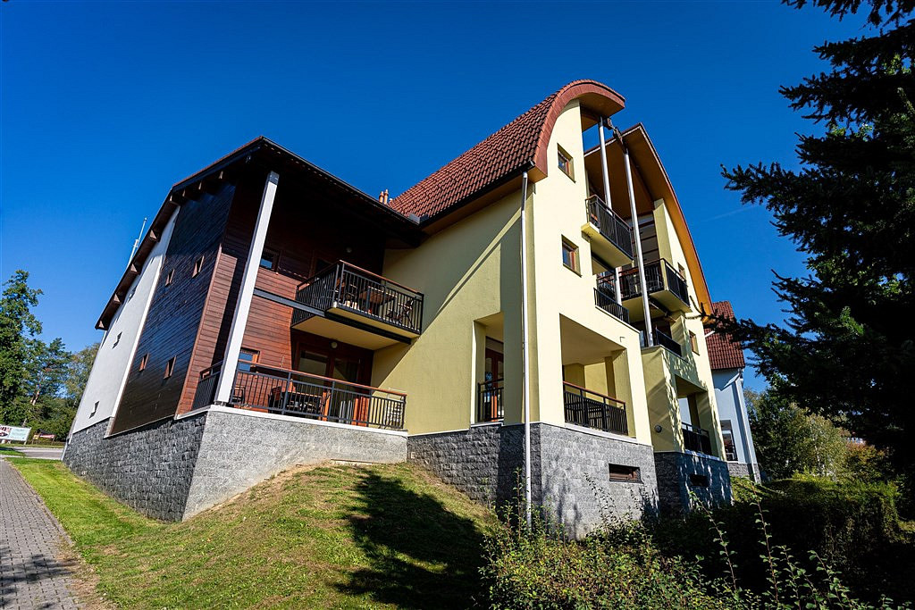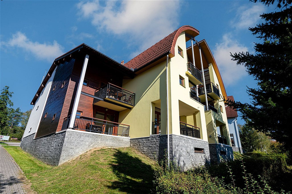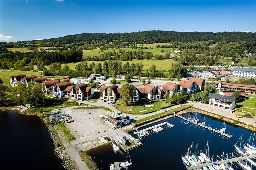 Apartmán s přímým výhledem na Lipno se nachází ve zvýšeném přízemí budovy a podlahová plocha činí 69,5m².
