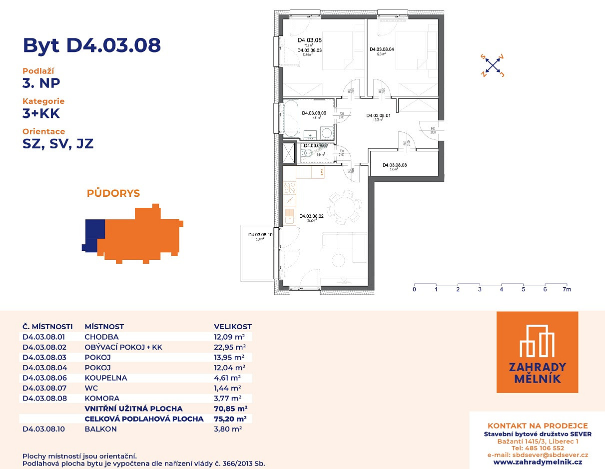 Jedná se o byt 3+kk o velikosti 75,2 m² s balkónem o velikosti 3,80 m². Byt se nachází ve 3. nadzemním podlaží moderní novostavby s výtahem.