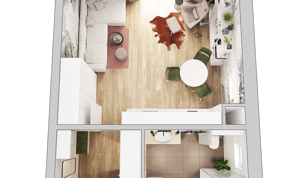 Jednotka se nachází ve 1NP a je členěná na vstupní chodbu, obývací pokoj s kuchyňským koutem, koupelnu. Součástí bytu je balkon s výhledem do zeleně, sklepní koje, i parkovací místo u domu.