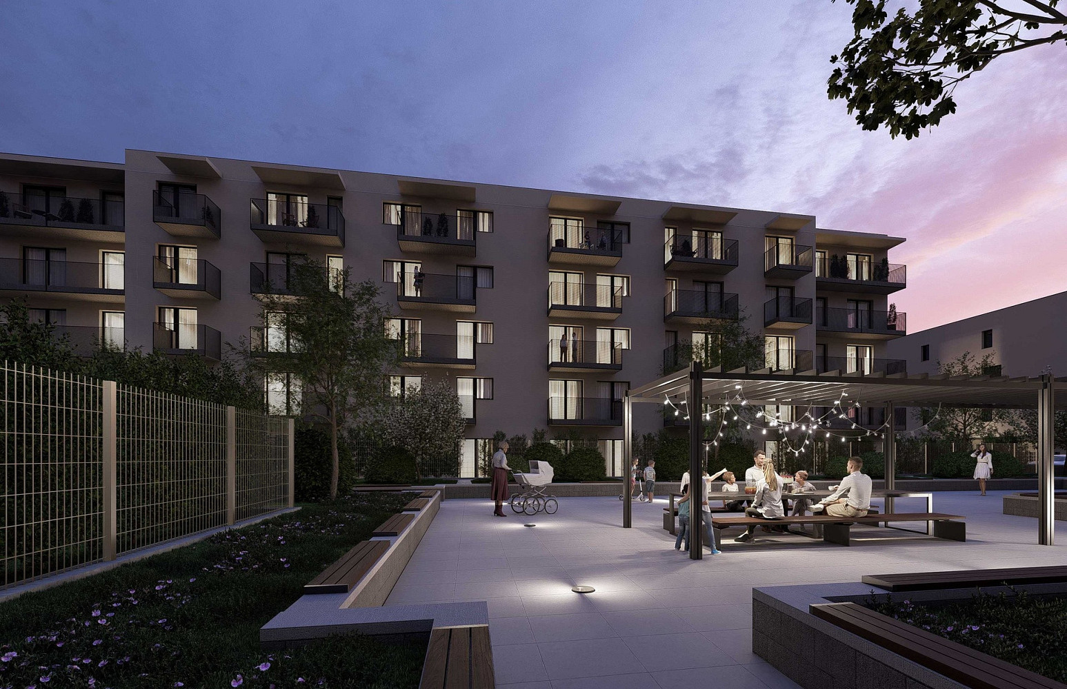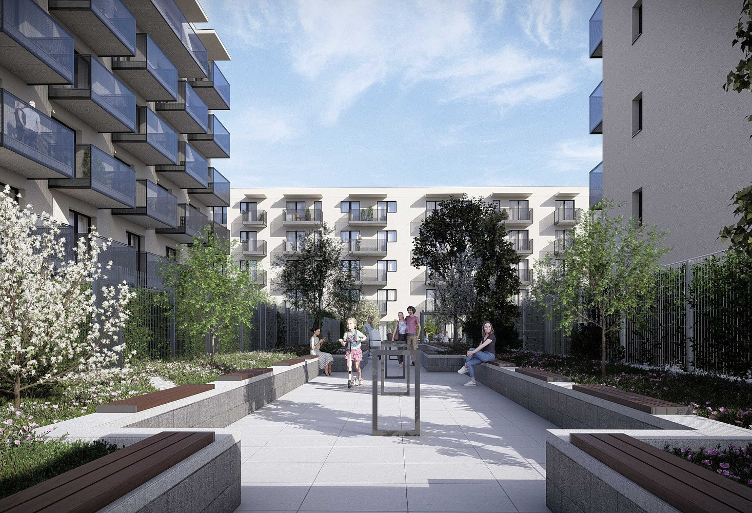 Zde se jedná o jednotka (B_1.06) o dispozici 1+kk a CP 27,65 m² se bude nacházet ve 1. NP/6 bytového domu "B" a bude disponovat terasou 9,04 m² a zahrádkou 28,27 m² s orientací na jih do vnitrobloku. K bytu je nutno dokoupit i vnitřní parkovacího stání v suterénu pod domem za 490.000,- Kč vč. DPH.