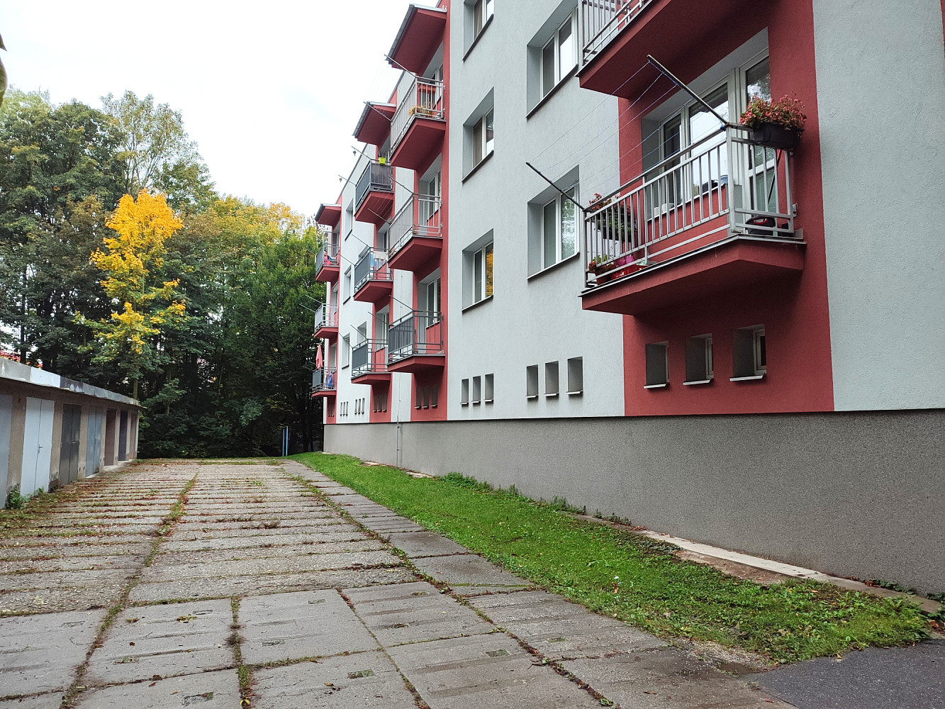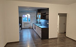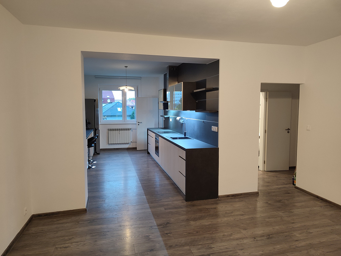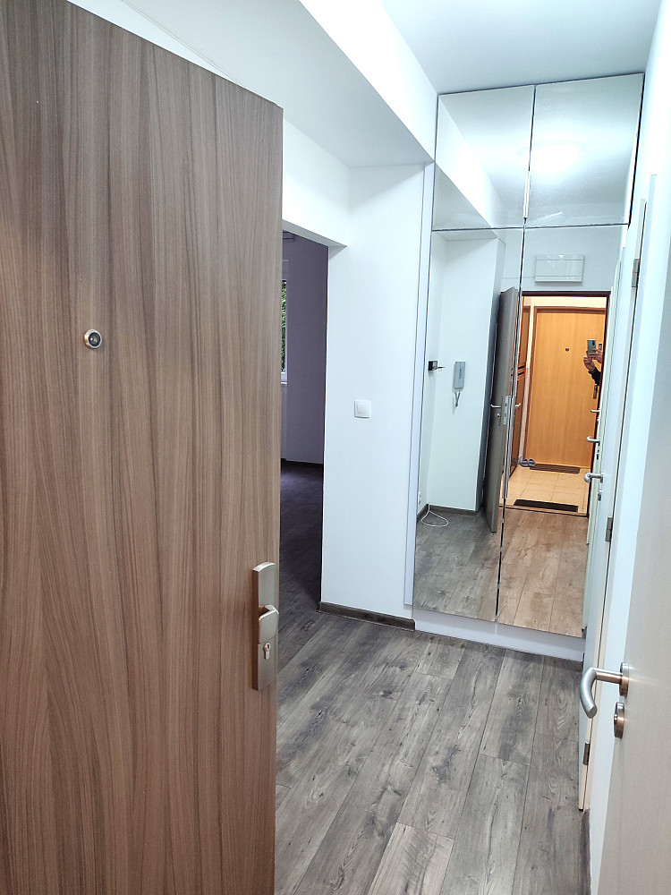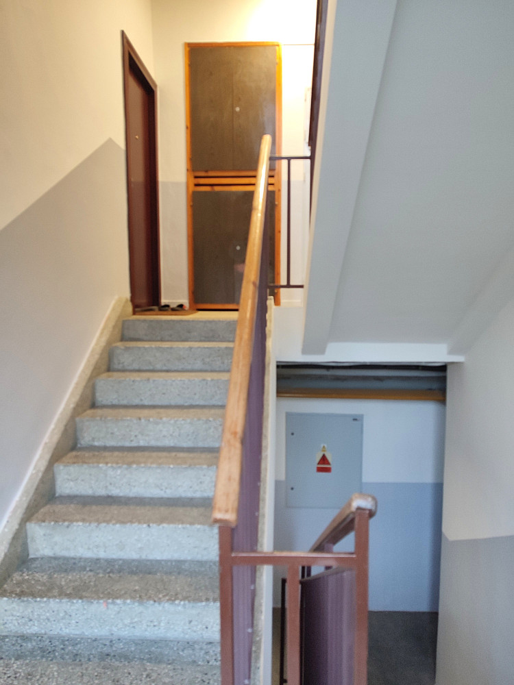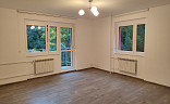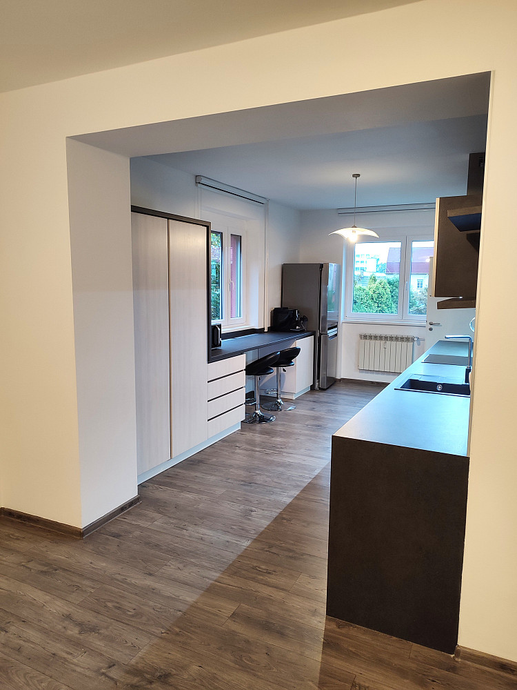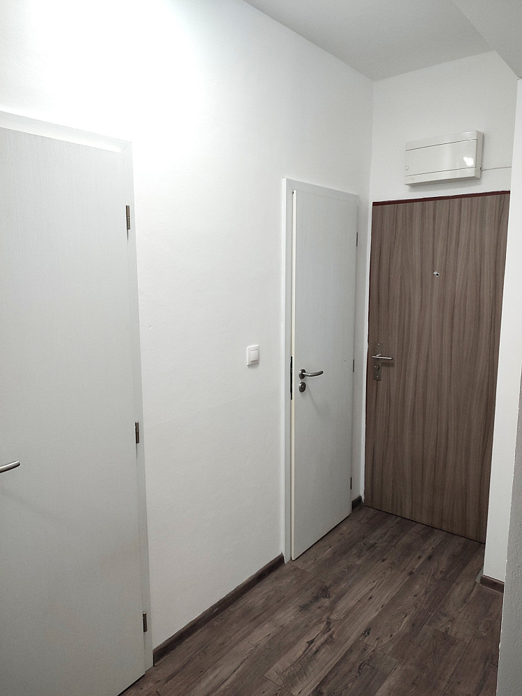 Do bytu se vstupuje přes zádveří, z kterého je vstup do dvou obytných místností bytu (ložnice a obývacího pokoje s jídelnou a kuchyňským koutem), koupelny a samostatné toalety. Dispozice bytu byla upravena z 3+1 na moderní a prostorné 3+kk. Obývací pokoj se spojen s kuchyňským koutem se zánovní kuchyňskou linkou na míru s vestavěnými spotřebiči zn. Whirpool (sklokeramická deska, digestoř, el. horkovzdušná trouba, vše funkční a ve velmi zachovalém stavu). V kuchyňské lince je i vestavěná myčka na nádobí zn. Mora, která je skoro nová. Z kuchyňského koutu je vstup do menšího dětského pokoje orientovaného na severozápad. Z obývacího pokoje situovaného na jihovýchod je možné vyjít na zrekonstruovaný prosluněný balkon s výhledem do klidné zadní části domu s garážemi a spoustou zeleně. Ložnice je samostatná, přístupná ze zádveří, se zánovní manželskou postelí a šatní skříní. Jelikož se jedná o rohový byt, jsou v bytě (na štítové stěně domu) navíc dvě velká okna (obývací pokoj a kuchyň), které byt krásně prosvětlují a umožňují výhled z bytu do okolní zeleně. Ve zděné koupelně jsou instalované vkusné obklady a dlažba, moderní sprchový kout, umyvadlo a příprava na pračku se sušičkou. Ve vedlejší samostatné místnosti je závěsné WC s novým el. kotlem na ohřev TUV. Vytápění bytu je centrální z plynové kotelny v domě. Na podlahách jsou položeny kvalitní vinylové podlahy, obložkové zárubně s novými dveřními křídly, na všech plastových oknech jsou namontované předokenní žaluzie (byt prošel celkovou a vkusnou rekonstrukcí v roce 2015). Byt i dům jsou velmi tiché, dům je umístěn na konci slepé ulice, s výhledem do klidného okolí s dostatkem zeleně. 2 min. chůze od domu je obchod s potravinami, restaurace a další drobné obchody se zbožím a službami. Velkou výhodou bytu jsou i nízké měsíční poplatky, skvěle fungující společenství majitelů bytových jednotek a dobré parkování v okolí domu.