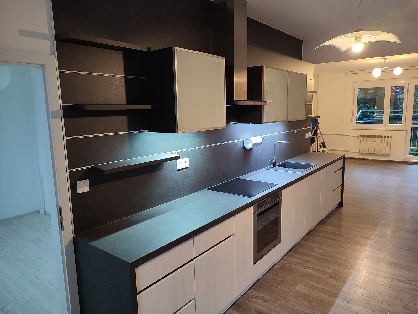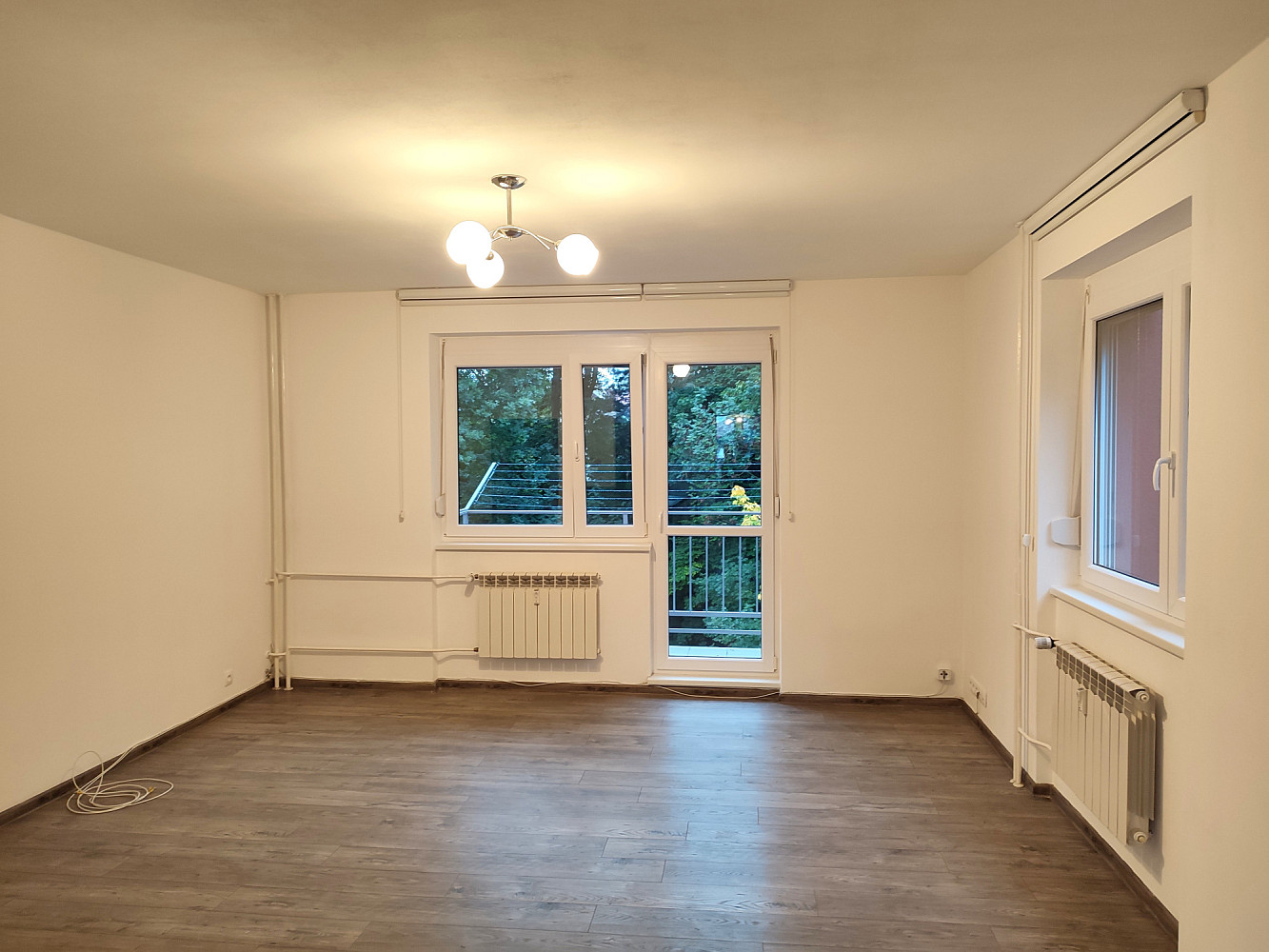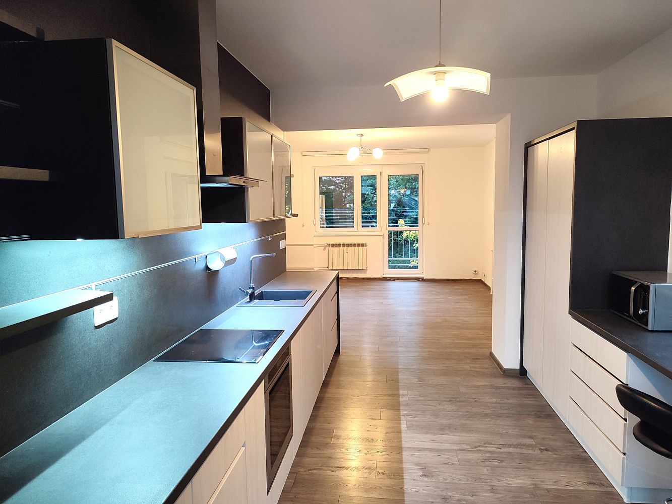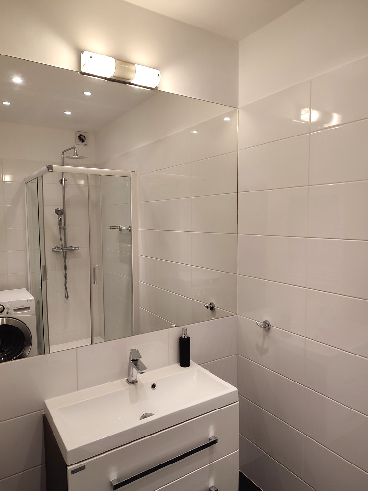 Do bytu se vstupuje přes zádveří, z kterého je vstup do dvou obytných místností bytu (ložnice a obývacího pokoje s jídelnou a kuchyňským koutem), koupelny a samostatné toalety. Dispozice bytu byla upravena z 3+1 na moderní a prostorné 3+kk. Obývací pokoj se spojen s kuchyňským koutem se zánovní kuchyňskou linkou na míru s vestavěnými spotřebiči zn. Whirpool (sklokeramická deska, digestoř, el. horkovzdušná trouba, vše funkční a ve velmi zachovalém stavu). V kuchyňské lince je i vestavěná myčka na nádobí zn. Mora, která je skoro nová. Z kuchyňského koutu je vstup do menšího dětského pokoje orientovaného na severozápad. Z obývacího pokoje situovaného na jihovýchod je možné vyjít na zrekonstruovaný prosluněný balkon s výhledem do klidné zadní části domu s garážemi a spoustou zeleně. Ložnice je samostatná, přístupná ze zádveří, se zánovní manželskou postelí a šatní skříní. Jelikož se jedná o rohový byt, jsou v bytě (na štítové stěně domu) navíc dvě velká okna (obývací pokoj a kuchyň), které byt krásně prosvětlují a umožňují výhled z bytu do okolní zeleně. Ve zděné koupelně jsou instalované vkusné obklady a dlažba, moderní sprchový kout, umyvadlo a příprava na pračku se sušičkou. Ve vedlejší samostatné místnosti je závěsné WC s novým el. kotlem na ohřev TUV. Vytápění bytu je centrální z plynové kotelny v domě. Na podlahách jsou položeny kvalitní vinylové podlahy, obložkové zárubně s novými dveřními křídly, na všech plastových oknech jsou namontované předokenní žaluzie (byt prošel celkovou a vkusnou rekonstrukcí v roce 2015). Byt i dům jsou velmi tiché, dům je umístěn na konci slepé ulice, s výhledem do klidného okolí s dostatkem zeleně. 2 min. chůze od domu je obchod s potravinami, restaurace a další drobné obchody se zbožím a službami. Velkou výhodou bytu jsou i nízké měsíční poplatky, skvěle fungující společenství majitelů bytových jednotek a dobré parkování v okolí domu.
