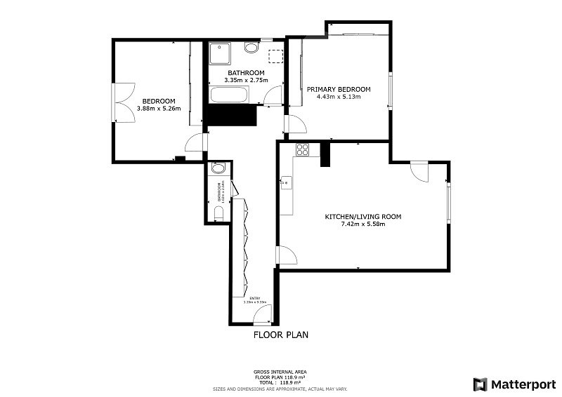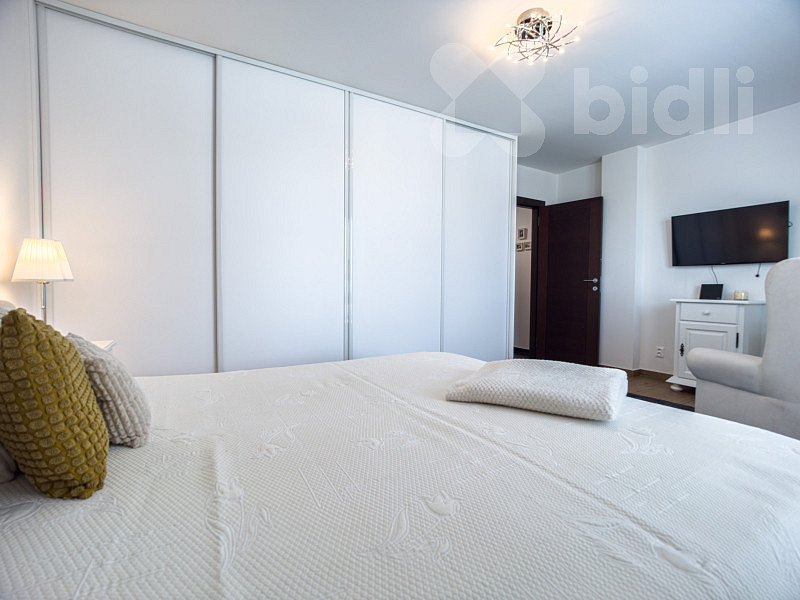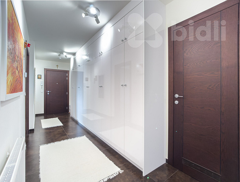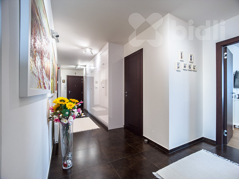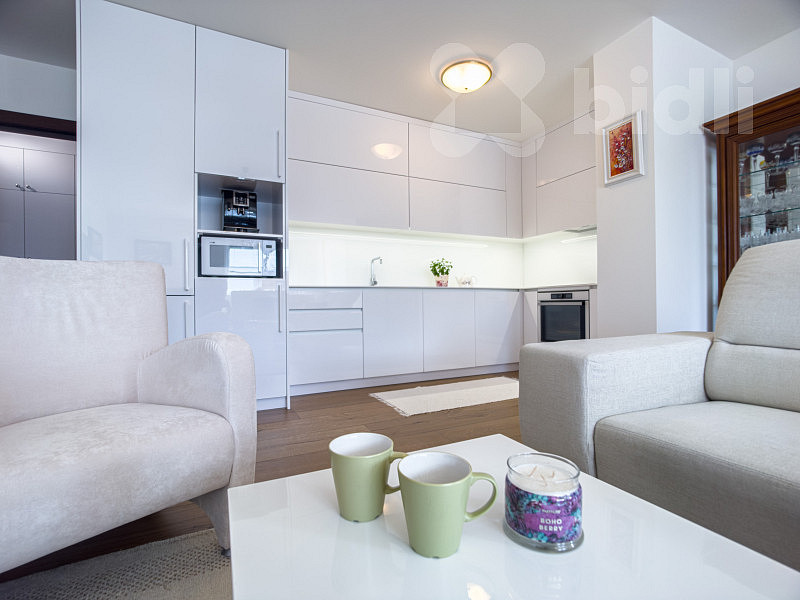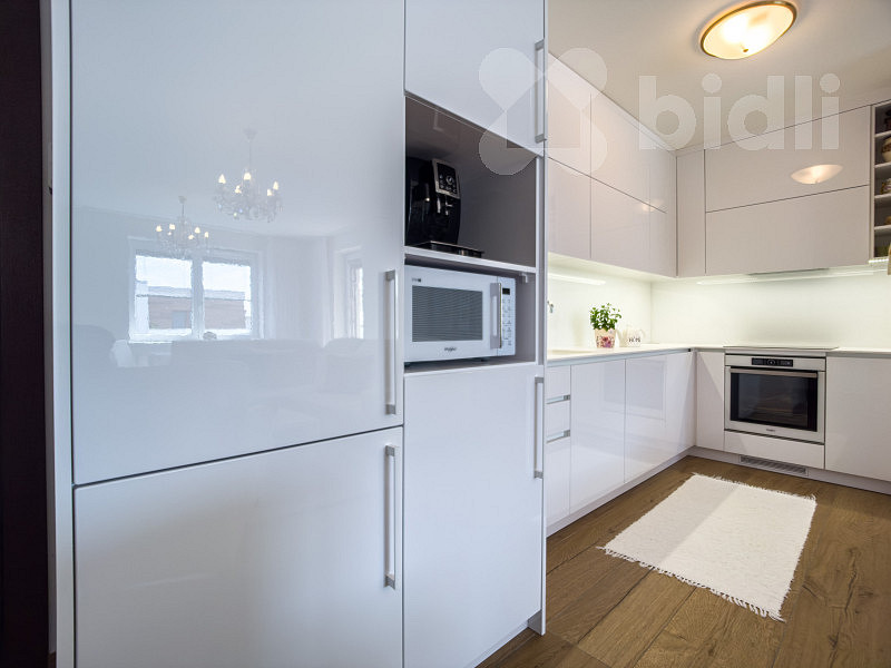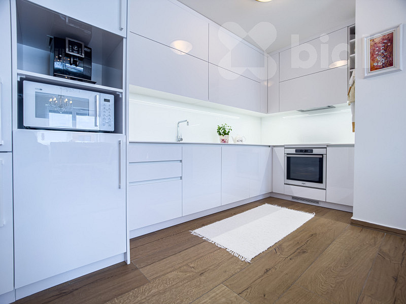 Interiér bytu je světlý, vzdušný a vkusně zařízený. Součástí vybavení je kvalitní kuchyňská linka na míru včetně vestavěných spotřebičů a praktické úložné prostory v podobě vestavěných skříní. Dispozice bytu je velmi dobře řešena - nabízí komfortní obývací část s kuchyní, dvě ložnice, moderní koupelnu, 2x WC a dostatek úložného prostoru.