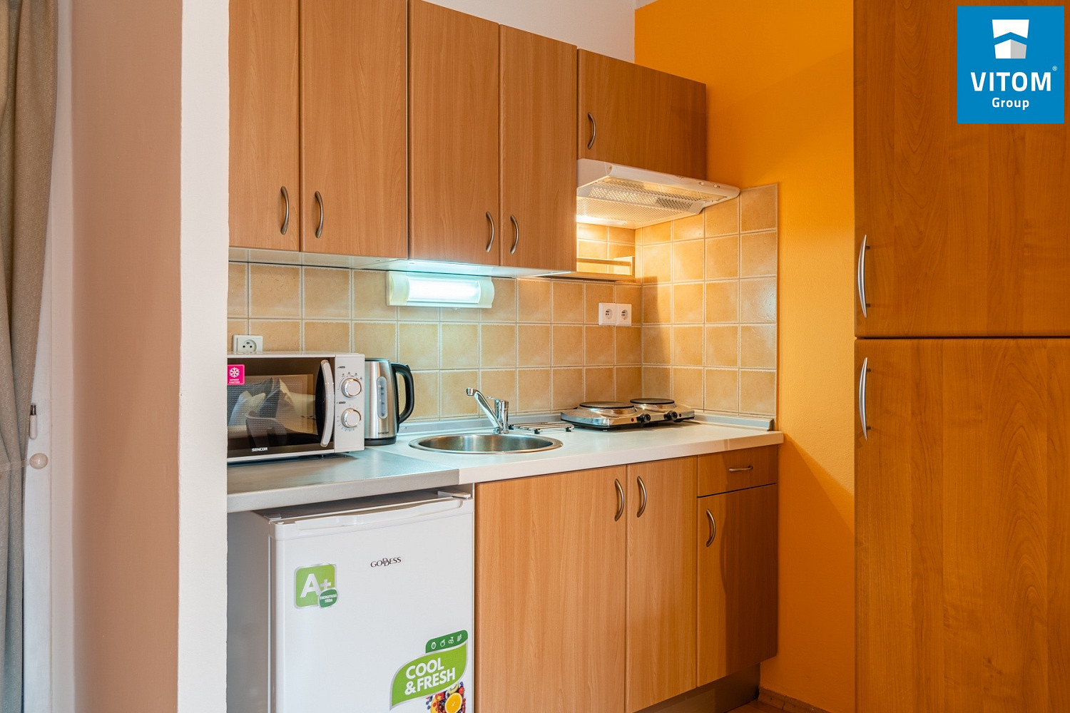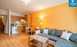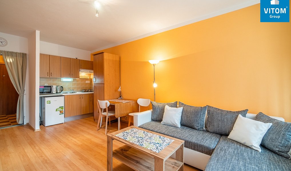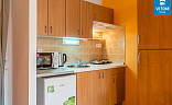 Byt se sestává z chodby s vestavěnou skříní, koupelny s vanou a pračkou, samostatné toalety a také z velkého pokoje, který rozdělen na kuchyňskou a obývací část. Kuchyňský kout je vybaven lednicí, mikrovlnnou troubou a rychlovarnou konvicí. K dispozici je rovněž elektrický vařič. Skládací jídelní stůl se židlemi je samozřejmostí. Obývací část je zařízena rozkládací rohovou sedačkou s konferenčním stolkem, obývací stěnou, televizí, rádiem, skříňkami a policovými díly. Posledním benefitem tohoto bytu je zasklená lodžie, která je situována na parkoviště před domem.