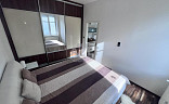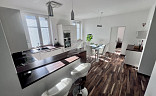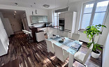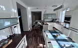 Dominantou bytu je moderní kuchyňská linka vybavená vestavěnými spotřebiči - lednicí, myčkou, troubou, mikrovlnnou troubou a varnou deskou.