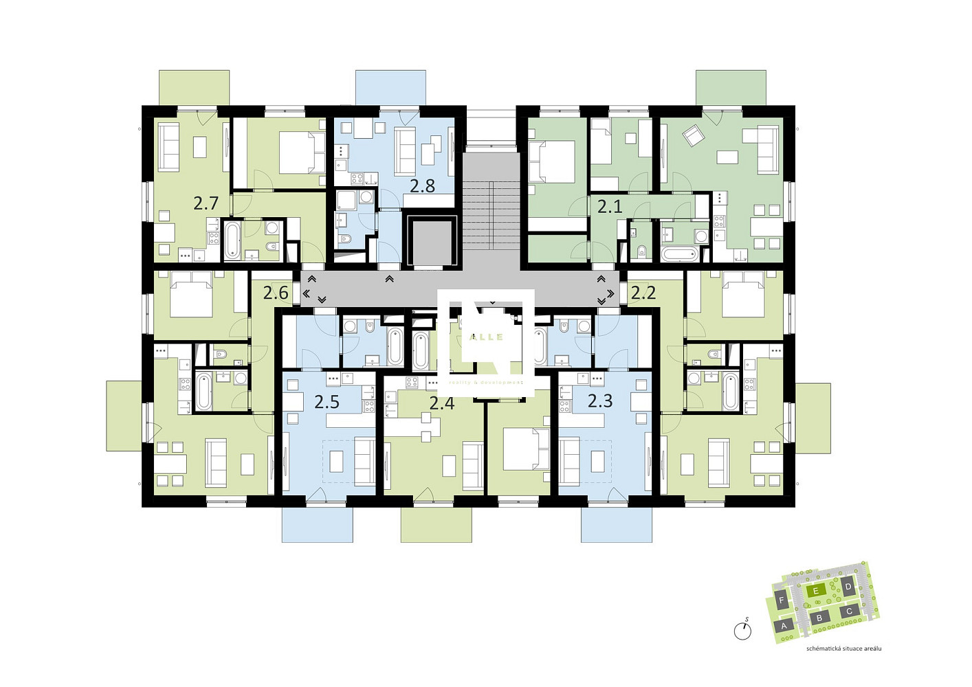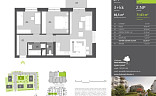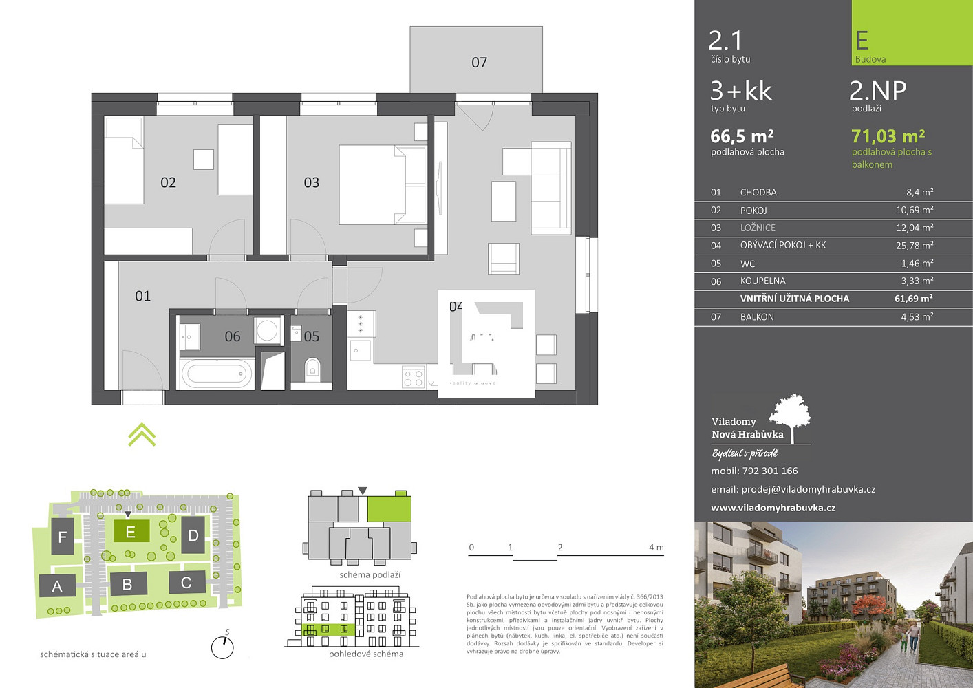 Byt s označením E2.1 o dispozici 3+kk se nachází ve 2. NP pětipodlažní budovy „E“. Bytová jednotka má rozlohu 66,5 m² k níž přísluší balkon o velikosti 4,53 m².