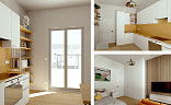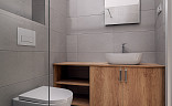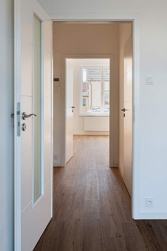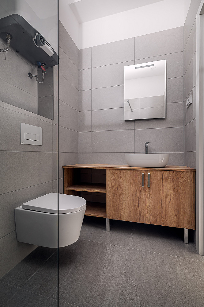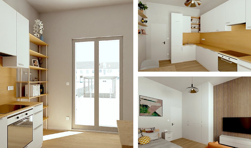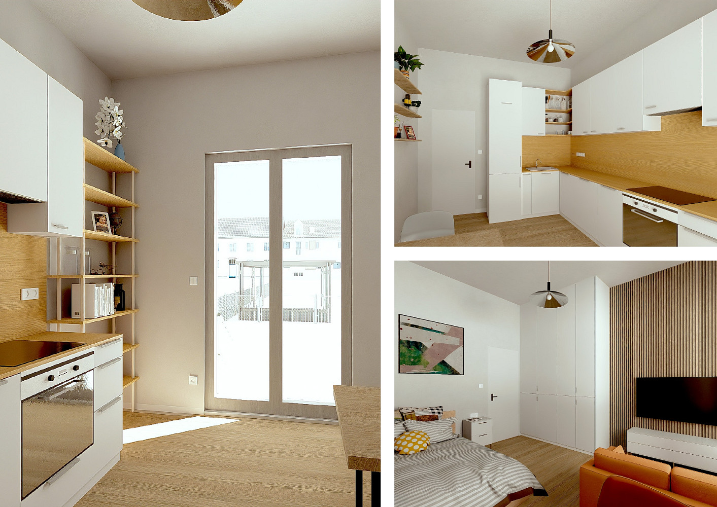 Dispozice bytu je navržena s důrazem na praktičnost a funkčnost. Po vstupu do bytu se nachází předsíň, která přirozeně odděluje vstupy do ložnice, kuchyně a koupelny s WC. Byt prošel kompletní rekonstrukcí a nabízí moderní interiér laděný do přírodních tónů v kombinaci dřeva, světlého kamene a bílé barvy. O vytápění a ohřev vody se starají elektrický kotel a bojler, zajišťují tak komfortní a úsporný provoz. Celkové řešení reflektuje potřeby městského bydlení a spojuje funkčnost s estetickým designem.