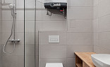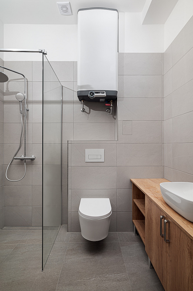 Koupelna je vybavena walk-in sprchovým koutem a systémem Audio World s voděodolným reproduktorem, který lze snadno propojit s mobilním telefonem – díky tomu si můžete dopřát oblíbenou hudbu i během každodenní hygieny.