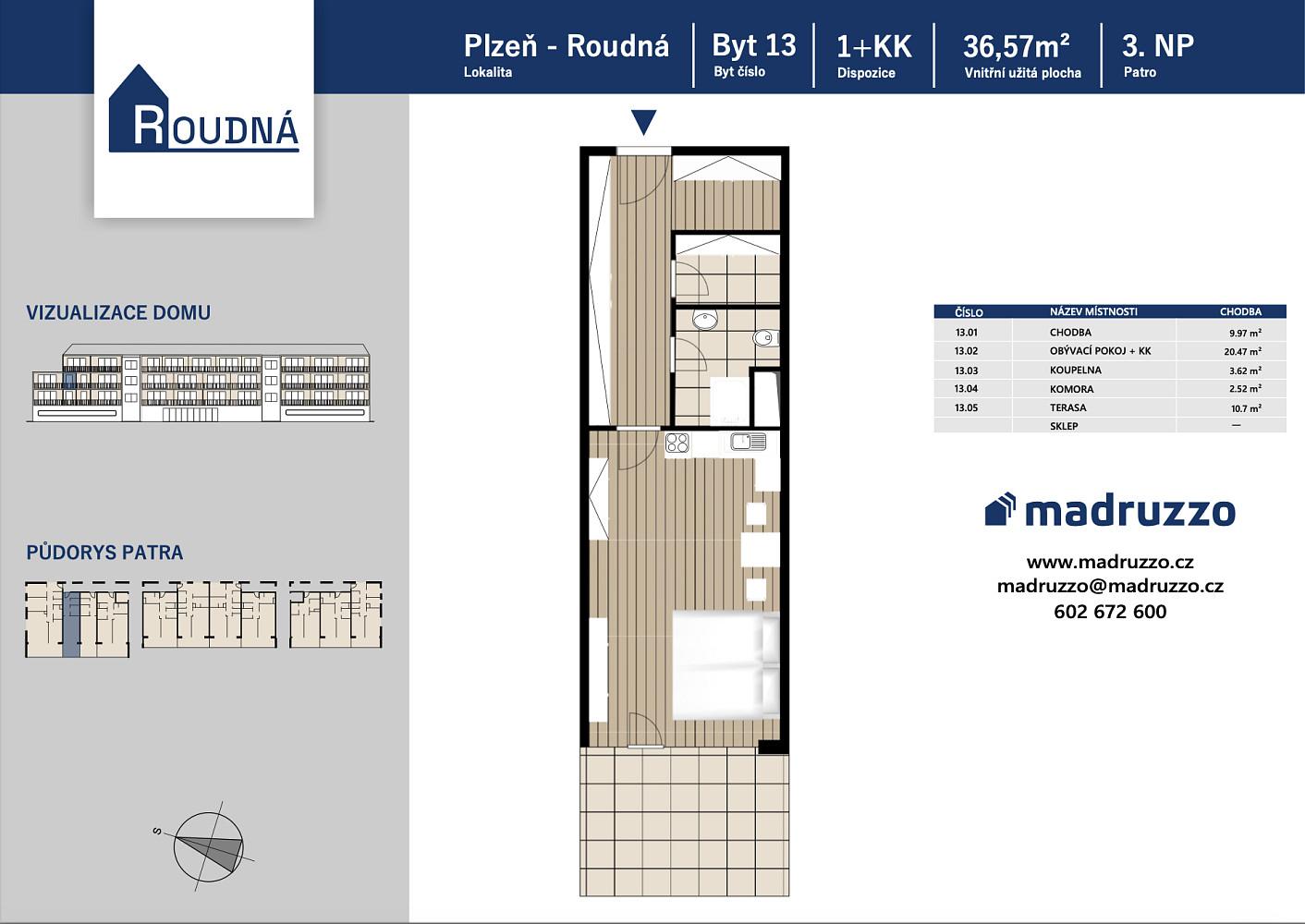 Nabízíme Vám prakticky řešený byt č. 13 o dispozici 1+kk a velikosti 36,6 m² s prostornou terasou o velikosti 10,7 m² umístěný ve 3. NP. Ideální bydlení pro páry anebo jako koupě na investici.
