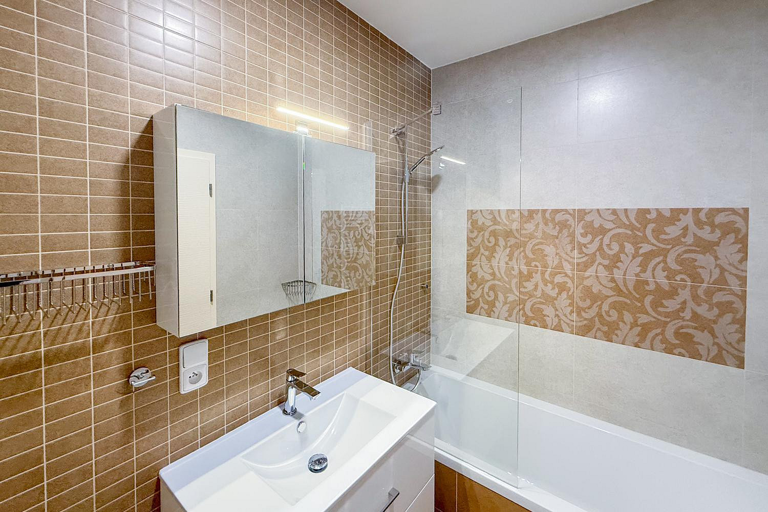 Součástí rekonstrukce je také nová koupelna a částečně zmodernizované vybavení kuchyně – nový dřez, baterie a myčka. Ostatní spotřebiče (lednice, varná deska a digestoř) jsou původní, ale plně funkční a ve velmi dobrém stavu. Kuchyňská linka je rovněž původní, ve výborné kondici