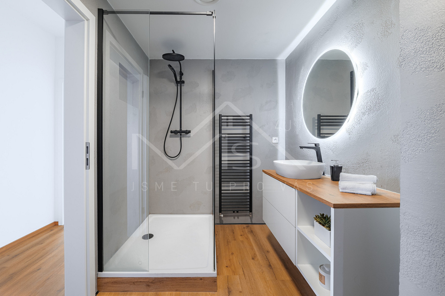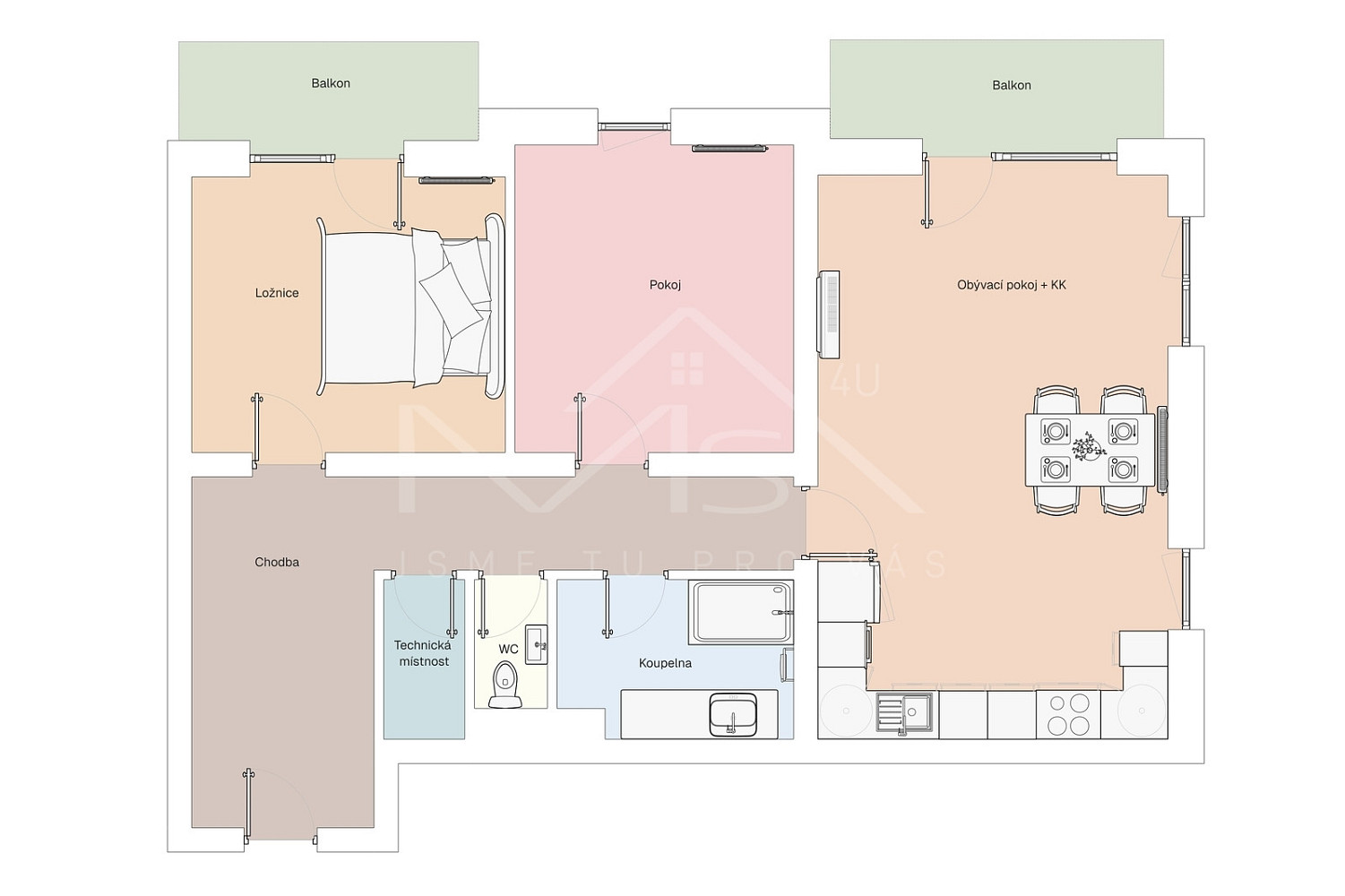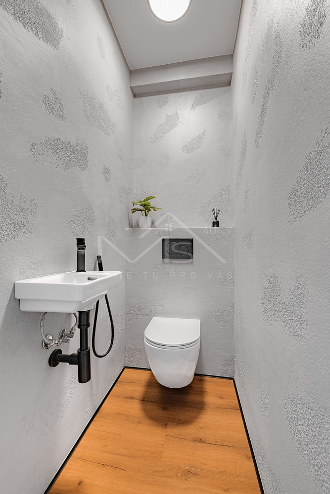 Dispozici tvoří obývací pokoj s kuchyňským koutem, ložnice, dětský pokoj, originálně řešená koupelna, samostatné WC a technická místnost.