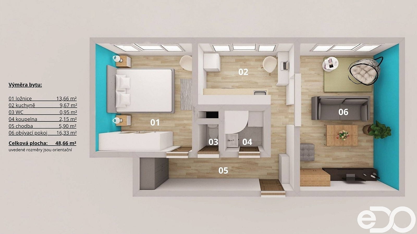 Praktické uspořádání, které dává smysl. Centrální chodba propojuje samostatnou kuchyň s oknem, dva neprůchozí pokoje a koupelnu s odděleným WC. Nechybí ani úložný prostor – ideální pro věci, které potřebují své místo mimo obývací zónu. Součástí nabídky je sklep.