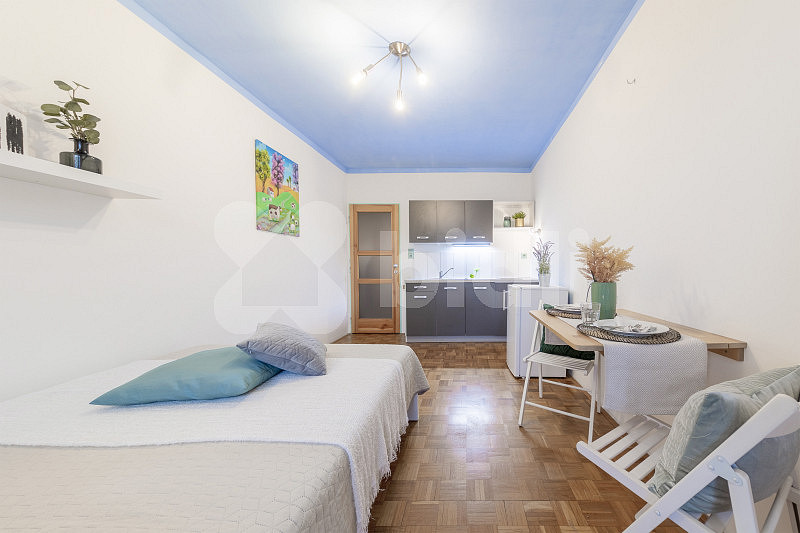 Větší byt pojme i 3člennou rodinu. K dispozici je obývací pokoj s kuchyní a ložnice. V koupelně se nachází vana i toaleta.