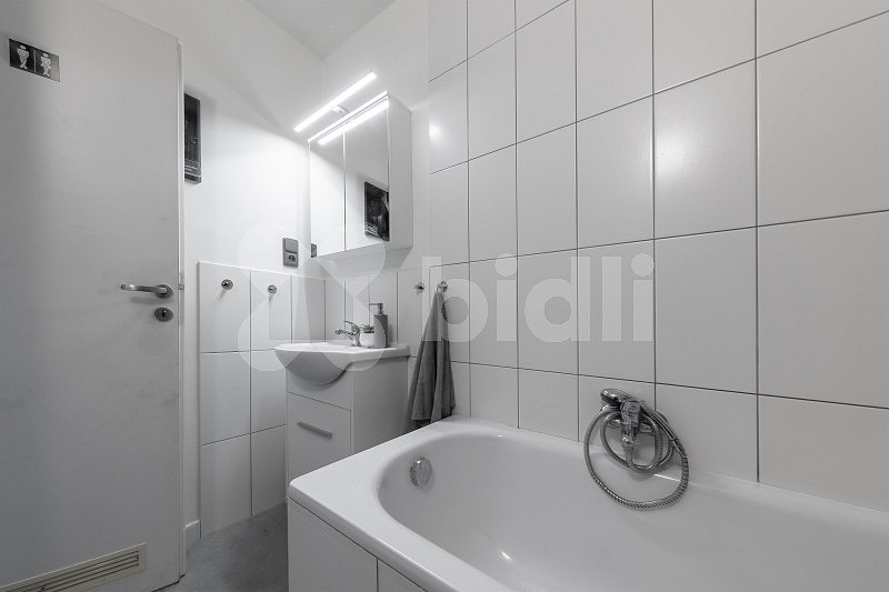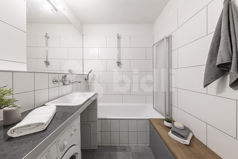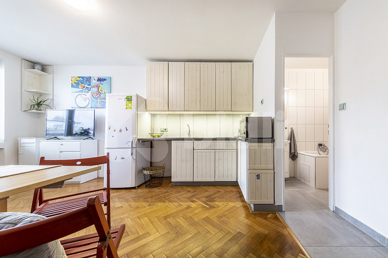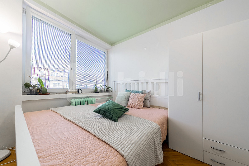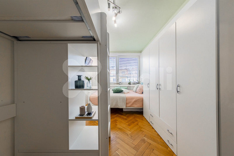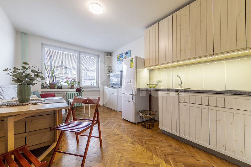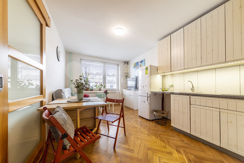 Menší byt má pěknou kuchyňku, přístup na vlastní lodžii s výhledem do vnitrobloku a velké vestavěné skříně. V koupelně je vana a místo pro pračku. Toaleta je samostatná.