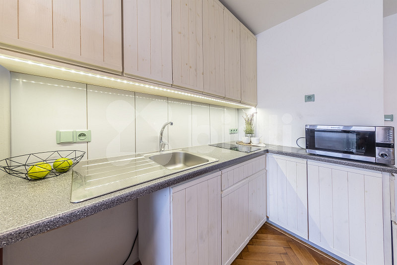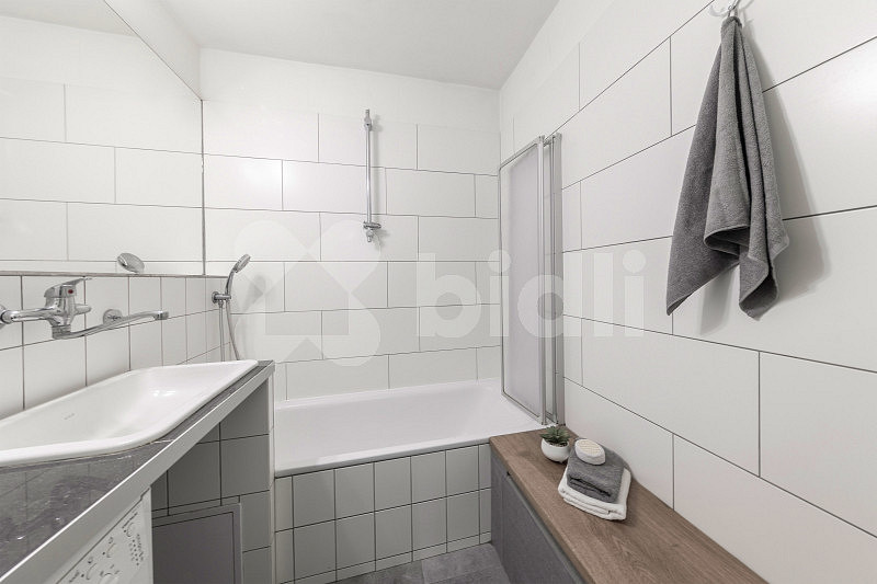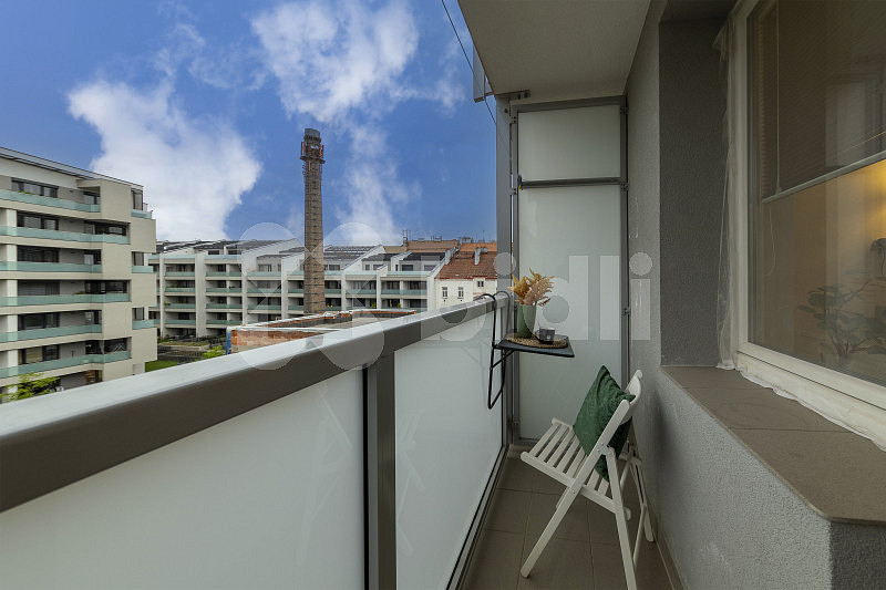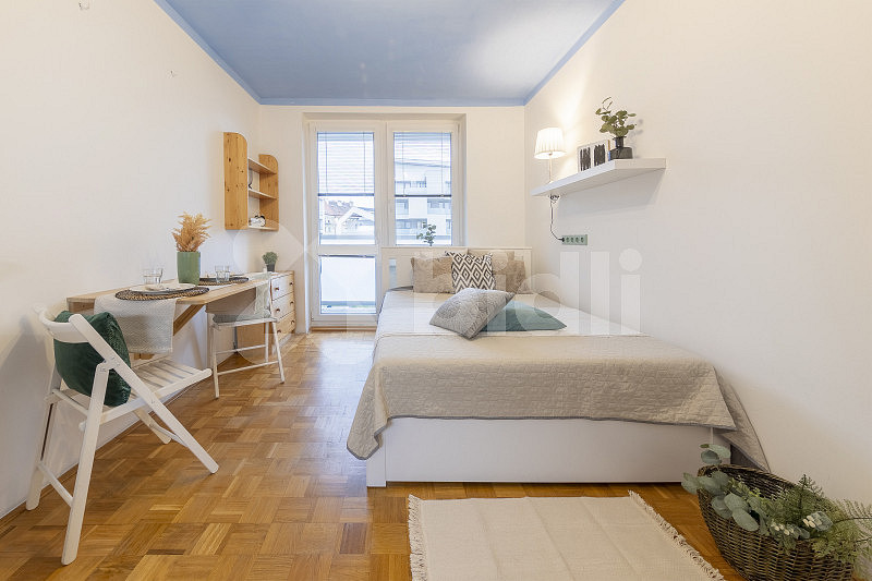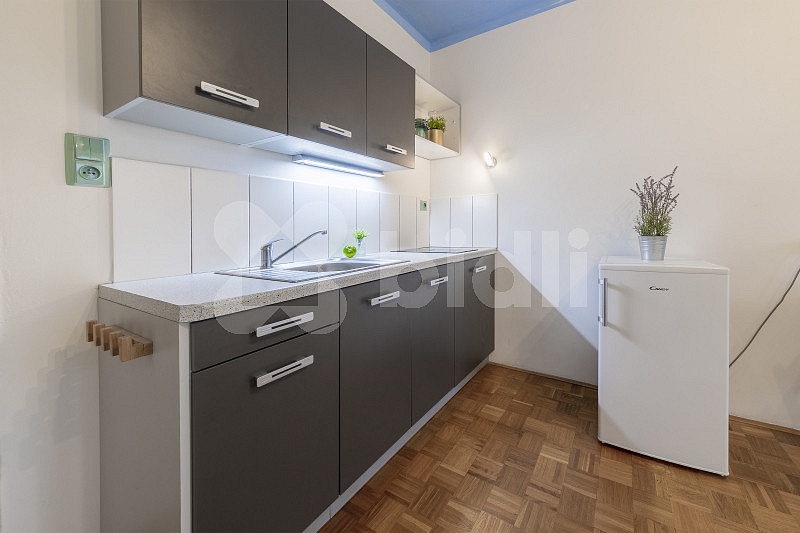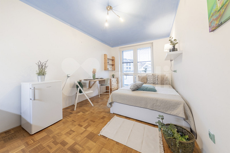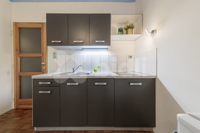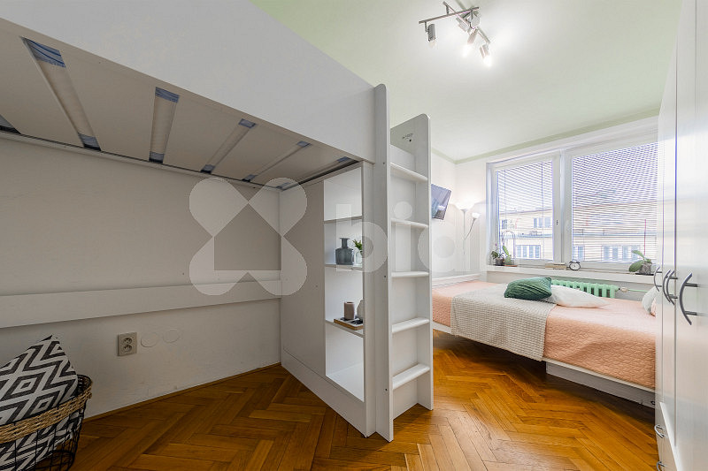 Menší byt má pěknou kuchyňku, přístup na vlastní lodžii s výhledem do vnitrobloku a velké vestavěné skříně. V koupelně je vana a místo pro pračku. Toaleta je samostatná.