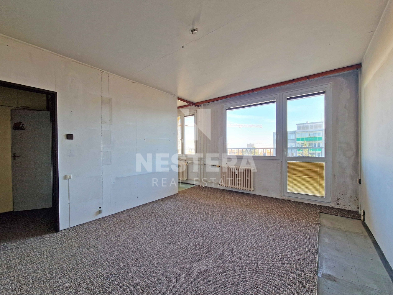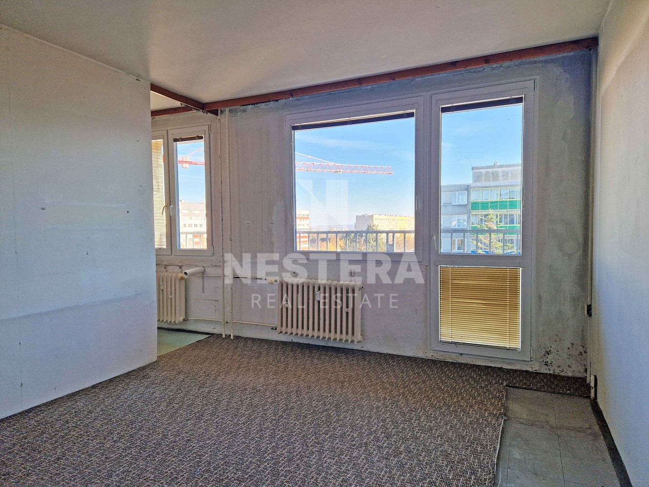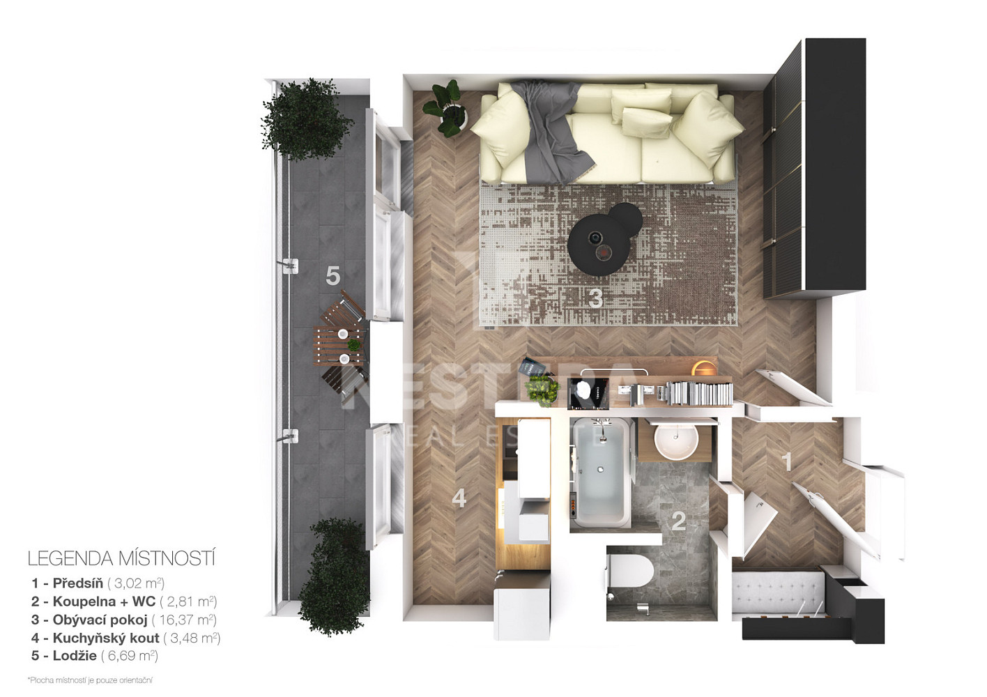 Bytová jednotka je dispozičně rozdělena na předsíň, obývací pokoj, kuchyňský kout, koupelnu s toaletou. Obývací pokoj poskytuje vstup na prostornou lodžii, ze které je pěkný výhled. Dále je k dispozici komora na patře, přímo před bytem, jako úložný prostor. V současné době je byt připraven na rekonstrukci dle představy budoucího majitele. Jedná se o byt v osobním vlastnictví. Vytápění jednotky je řešeno centrálně dálkově.