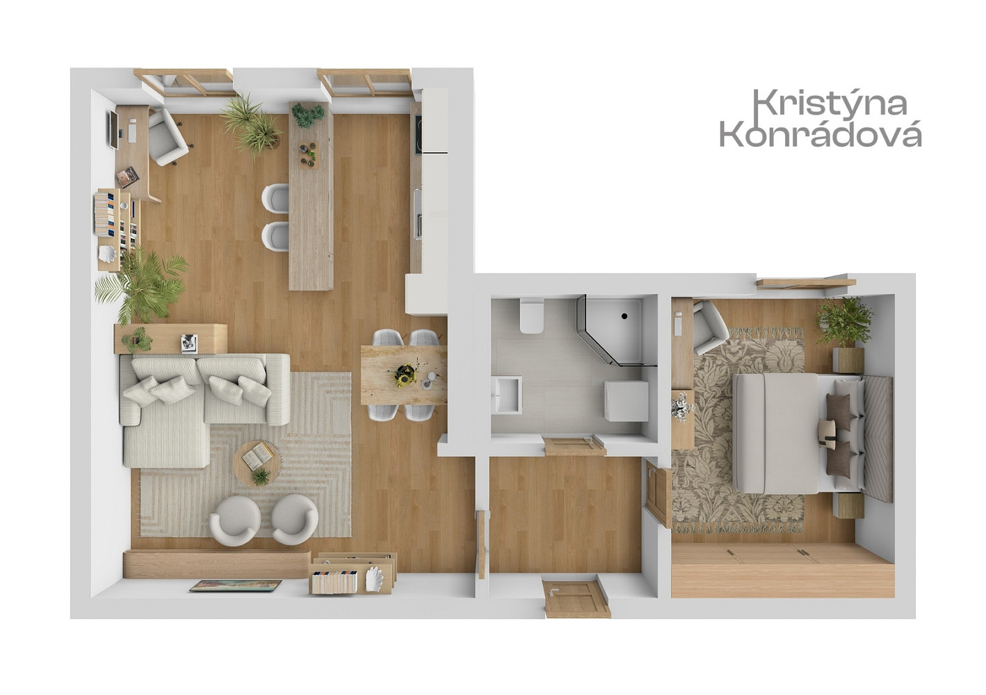 Interiér bytu působí prostorným a vzdušným dojmem, obývací pokoj s kuchyňským koutem má 39 m², ložnice 13 m², předsíň 5 m² a koupelna 4 m².