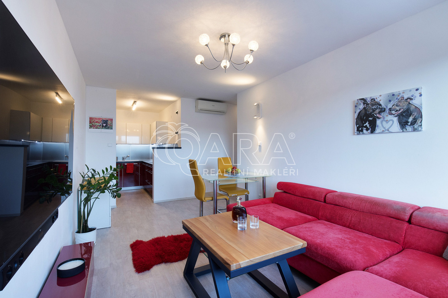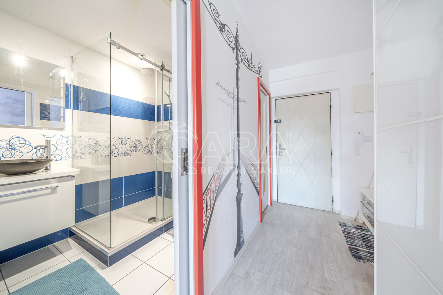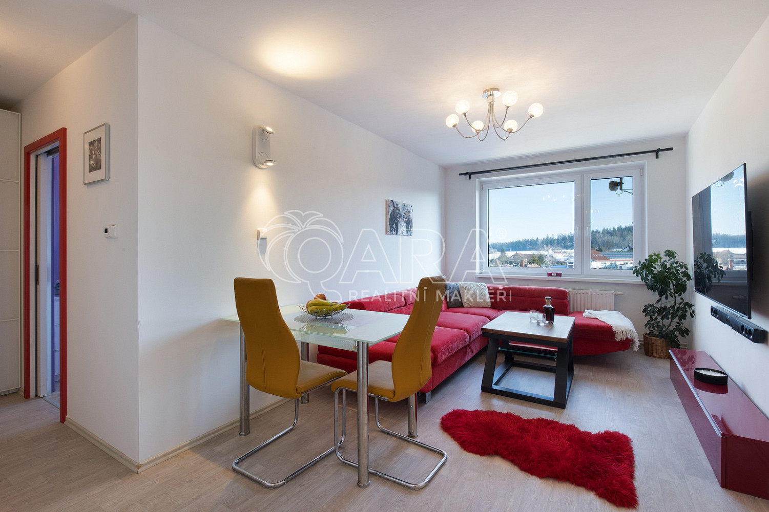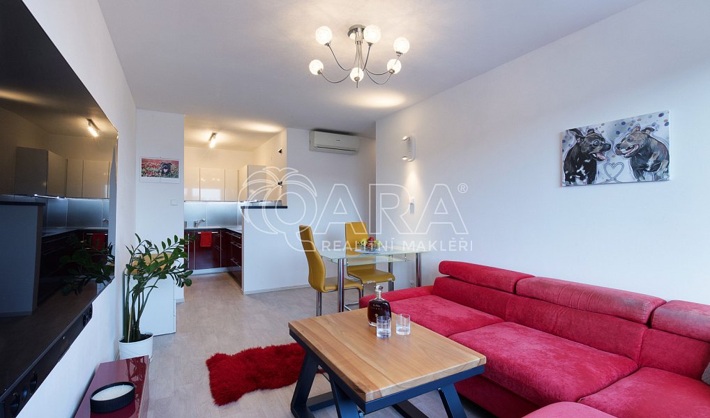Byt je po kompletní rekonstrukci, hýří barvami a má mnoho nadstandardních prvků – klimatizaci (umí i topit), velký sprchový kout, bodová světla, posuvné dveře nebo hlukově izolované stěny a podlahy. Provozní náklady jsou nízké, celkem asi 4 000 Kč pro 2 osoby. V kuchyni je zánovní plynový kondenzační kotel pouze pro tento byt. Ta je plně vybavena všemi elektrospotřebiči a kvalitním nábytkem. Okna bytu směřují na jihovýchod a je z nich krásný výhled do okolí.