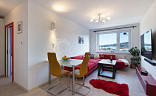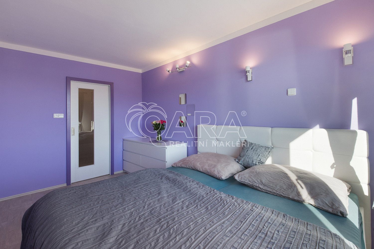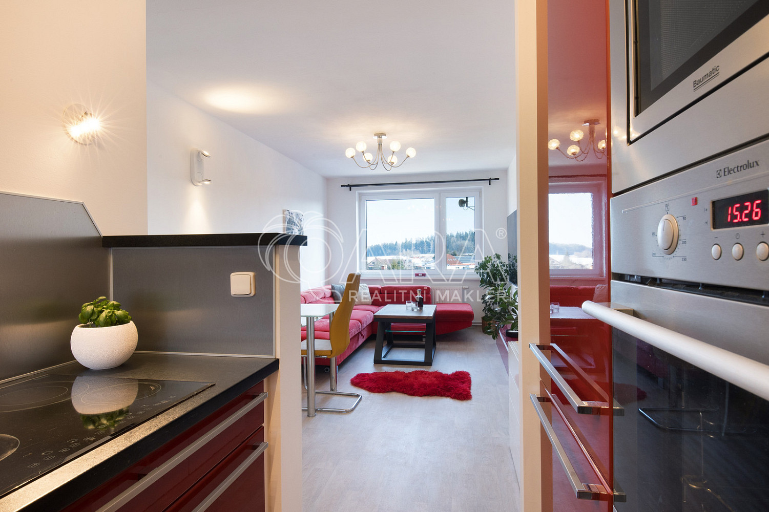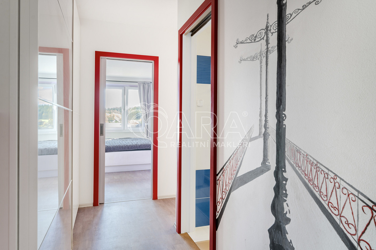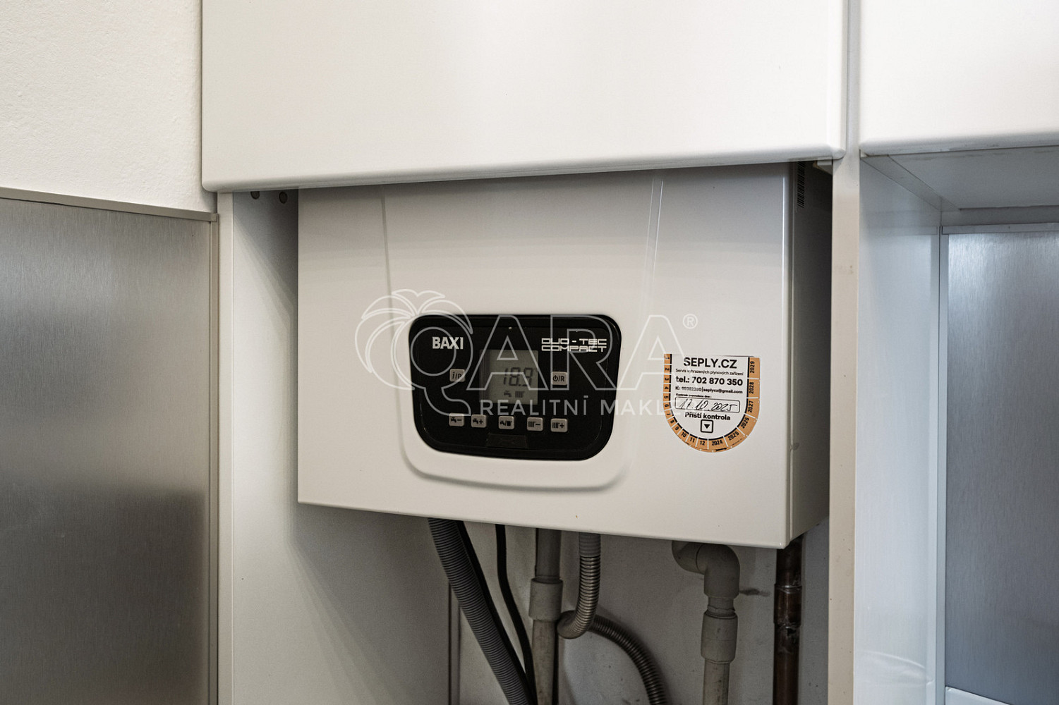 Byt je po kompletní rekonstrukci, hýří barvami a má mnoho nadstandardních prvků – klimatizaci (umí i topit), velký sprchový kout, bodová světla, posuvné dveře nebo hlukově izolované stěny a podlahy. Provozní náklady jsou nízké, celkem asi 4 000 Kč pro 2 osoby. V kuchyni je zánovní plynový kondenzační kotel pouze pro tento byt. Ta je plně vybavena všemi elektrospotřebiči a kvalitním nábytkem. Okna bytu směřují na jihovýchod a je z nich krásný výhled do okolí.