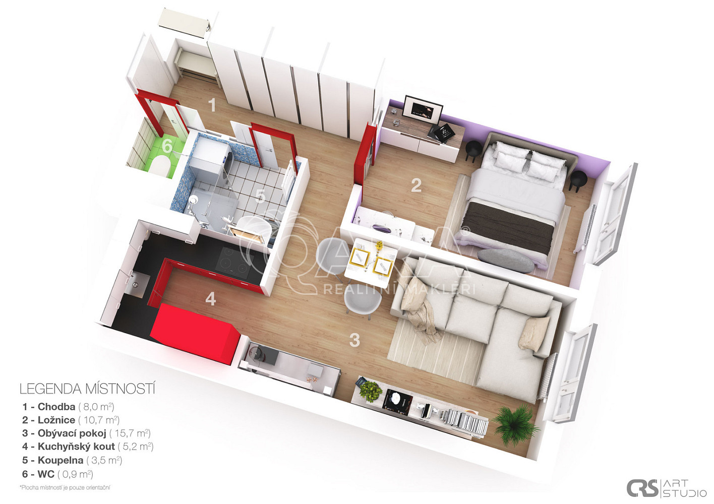 Moderní a barevný byt 2+kk o ploše 44 m² najdete v lokalitě, kde se byty moc neprodávají, protože si je původní majitelé drží ve vlastnictví. Poblíž se staví nové bytové domy v rámci Rezidence Zdaboř, které ale stojí cca 120 000 Kč/m² a to bez garážového stání, které si musíte dokoupit za 400 000 Kč.