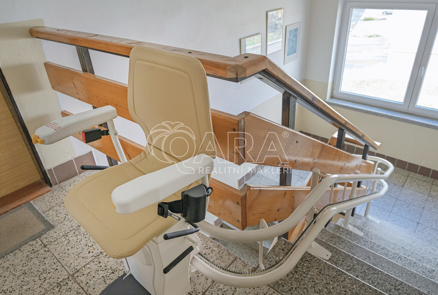 Nachází se ve třetím, nejvyšším, patře dobře udržovaného cihlového domu v energetické třídě C bez výtahu. Nedávno ale byla na schodišti nainstalována pojízdná plošina, takže se v případě potřeby můžete vyvézt nahoru. V přízemí lze využívat prostornou kolárnu. Dům má novou fasádu a jen 9 bytů.