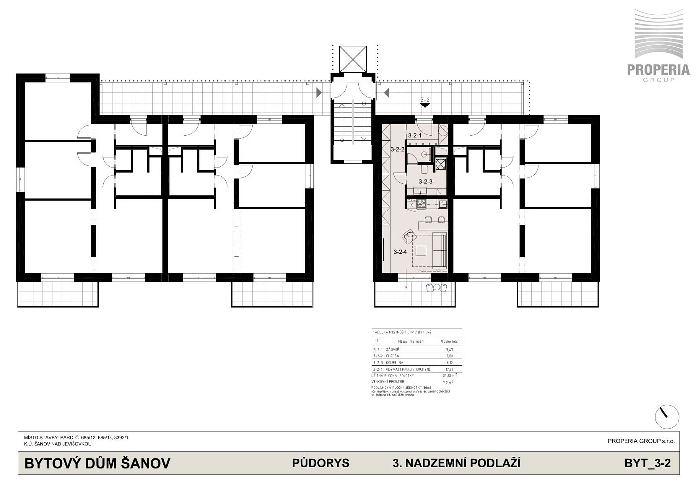 Nabízíme ke koupi příjemně řešený byt o dispozici 1+kk a velikosti 36m² s balkonem 7m², umístěný v 2. NP, třípodlažního bytového domu s výtahem v nově vznikající rezidenční části obce Šanov - moderní projekt, který propojuje architektonickou čistotu, komfort a klid venkovského života.