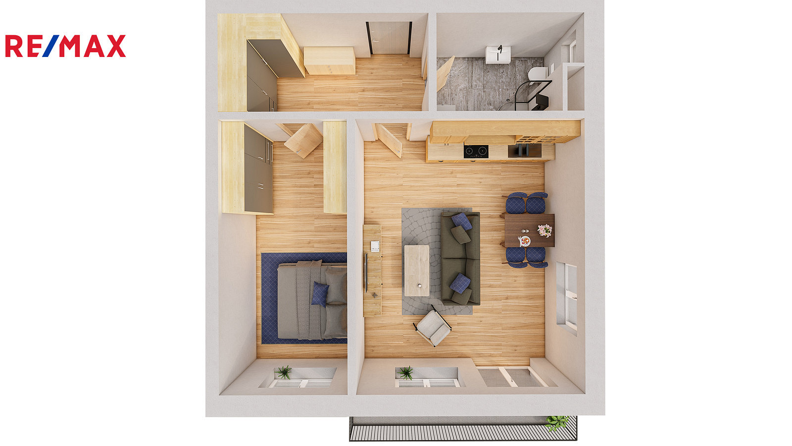 opticky zvětšuje místnost, ale také do ní přivádí množství denního světla. Terasa orientovaná na jihovýchod je ideálním místem k odpočinku po náročném dni. Můžete zde vytvořit pohodlné posezení, užívat si výhled a sluneční paprsky. Dostatečně velká vstupní předsíň nabízí možnost vestavěných skříní. Stejně tak je počítáno i s místem na úložné prostory v ložnici. Koupelna je moderní se sprchovým koutem a je pamatováno i na prostor pro pračku se sušičkou. Okna celého bytu jsou orientovaná na západ což