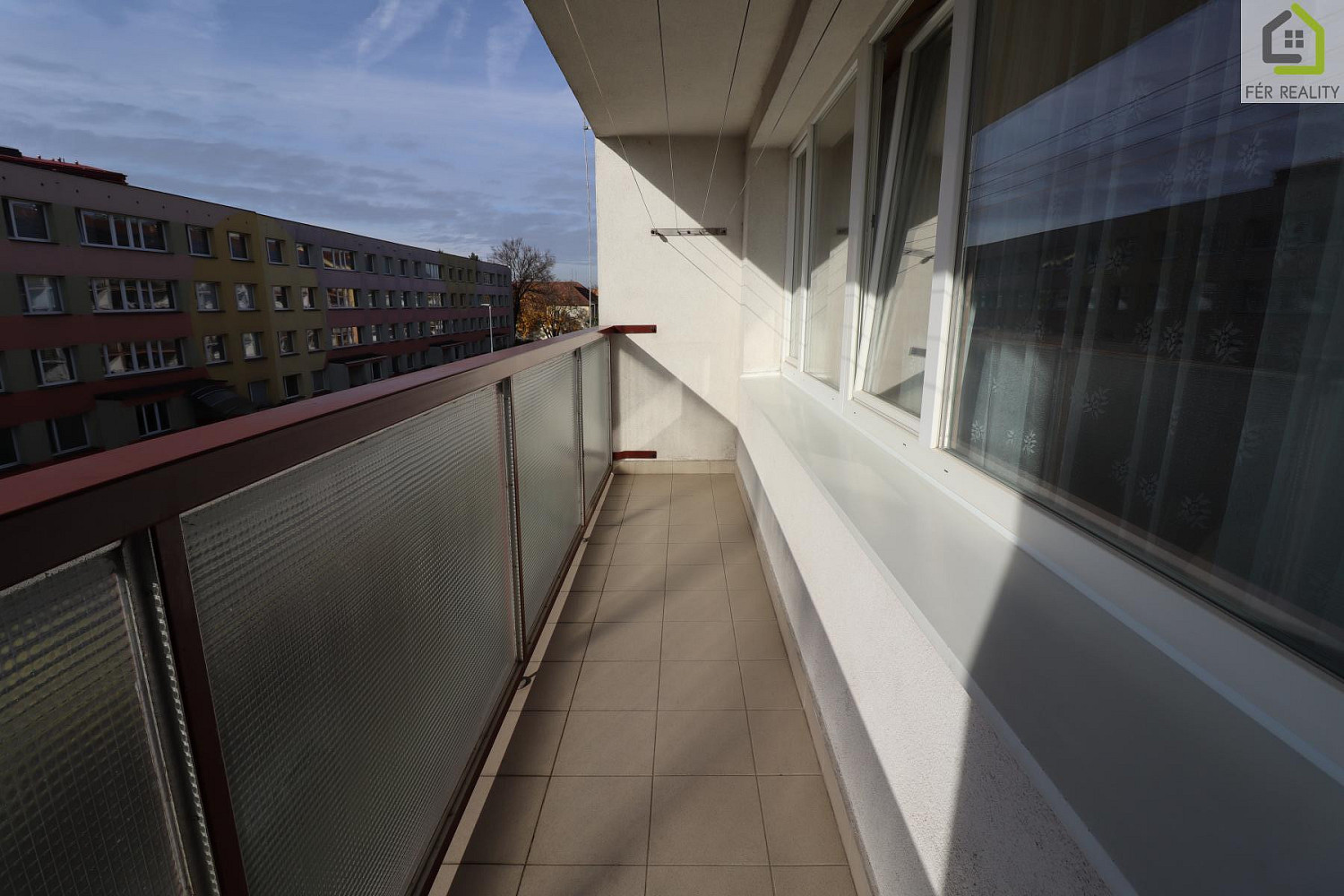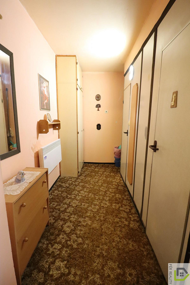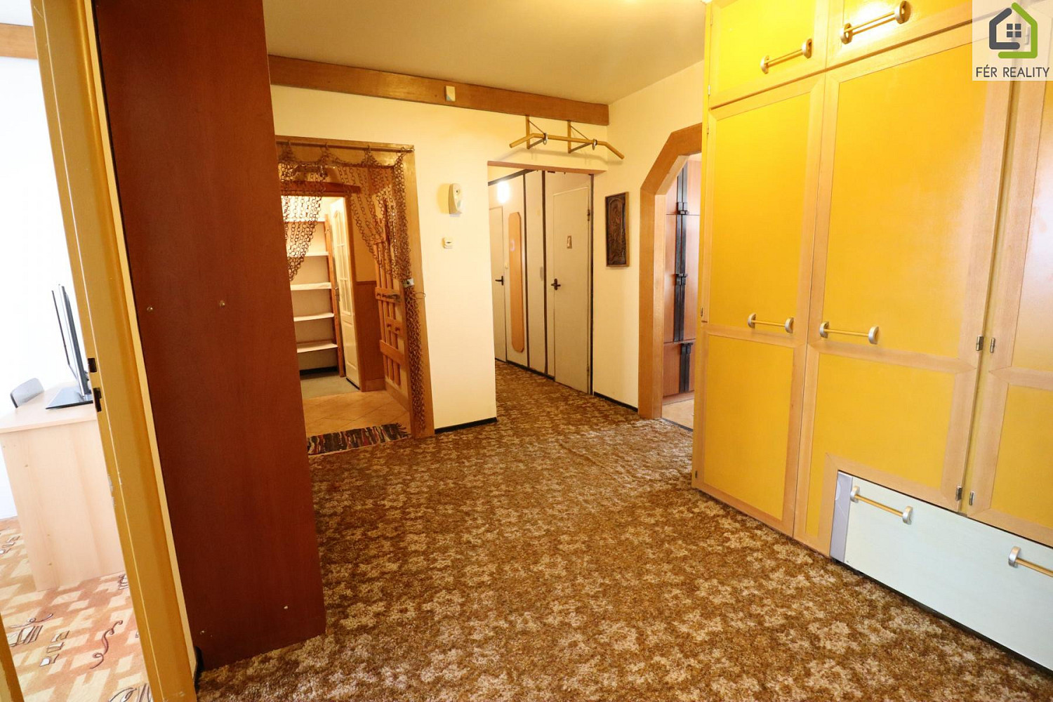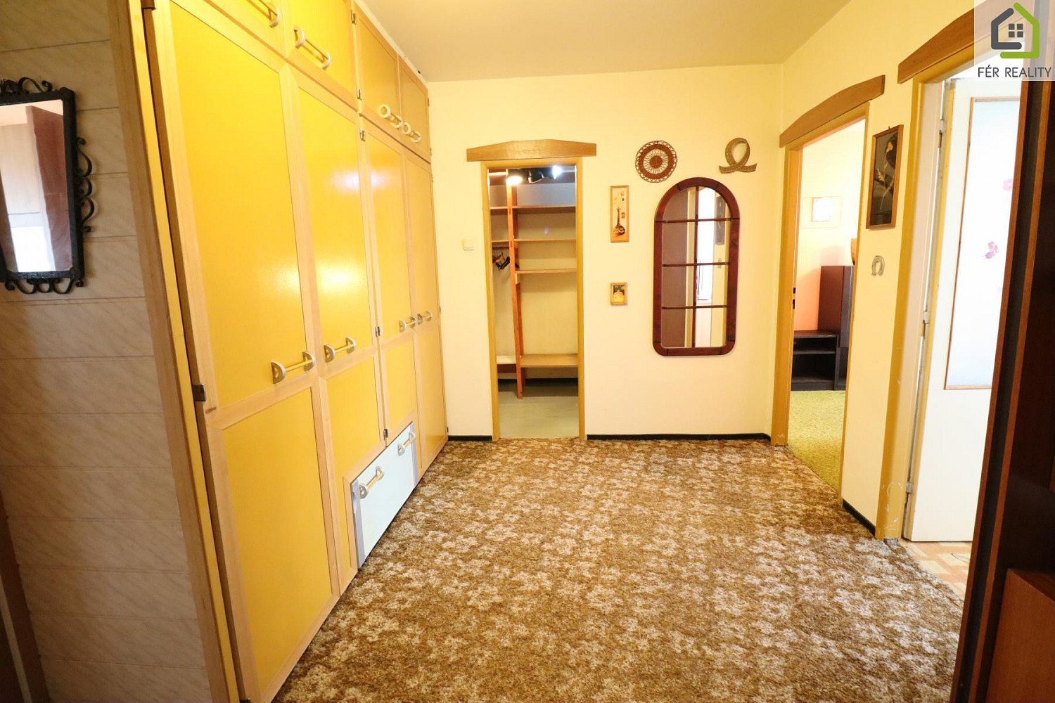 Realitní kancelář Fér reality Vám zprostředkuje možný prodej velkorysého bytu 3+1 o celkové výměře 90 m² obytné plochy se dvěma lodžiemi. Byt se nachází ve druhém patře. Jednotka je v původní stavu vhodná k realizaci vlastních představ. Skládá se z kuchyně (vstup na lodžii), obývacího pokoje (vstup na druhou lodžii), ložnice, dalšího pokoje, dvou komor, koupelny, toalety a prostorné chodby. V celém bytě jsou plastová okna. Na podlahách je kombinace pvc a dlažby. Výhodou je vlastní fotovoltaika, která je umístěná na střeše (pro celý vchod). Topení a ohřev vody je zajištěn dálkově. Elektřina v bytě je částečně v hliníku a v mědi. Stoupačky v bytě jsou v plastu. Bytu náleží k užívání prostorný sklep (6 m²). Dále zde najdeme prádelnu, sušárnu a kolárnu.