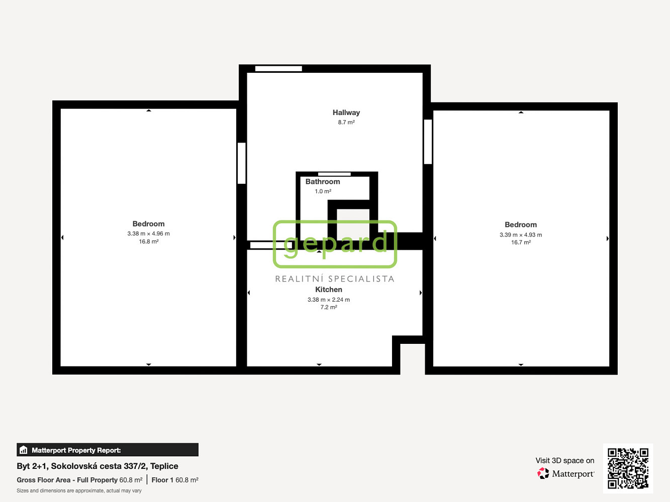 Byt disponuje dvěma prostornými pokoji (každý cca 17 m²), které nabízí dostatek místa pro komfortní obývání i soukromí. Kuchyně o velikosti 7 m² je prakticky situovaná, koupelna je vybavena sprchovým koutem a WC je oddělené. Součástí bytu je také vstupní chodba a sklepní kóje.