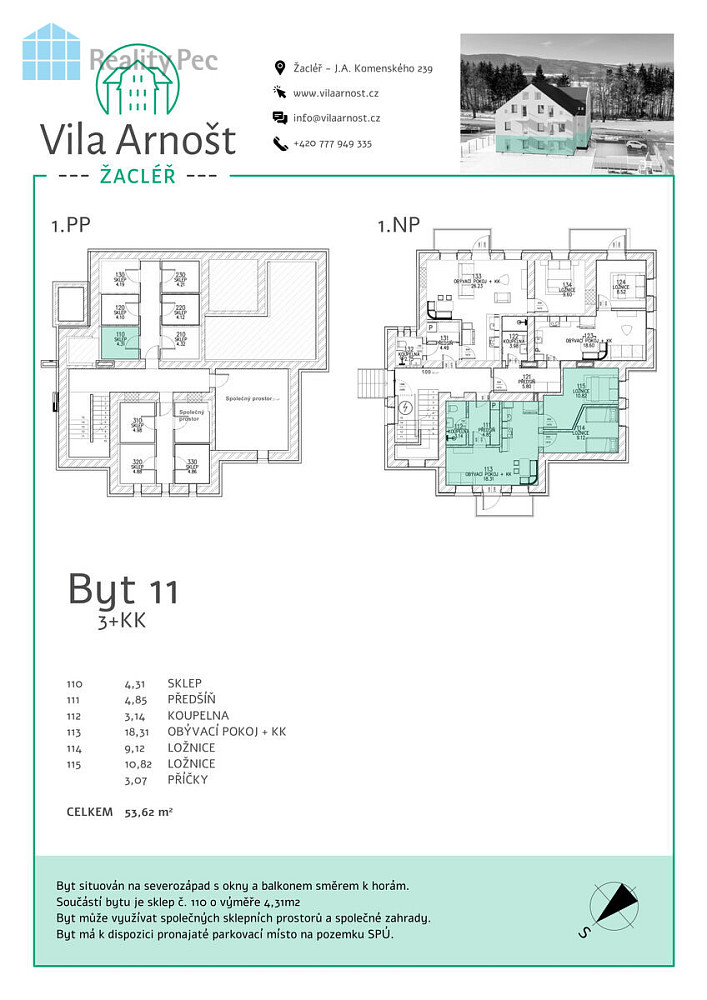 Nabízíme k prodeji kompletně zrekonstruovaný byt ve vile Arnošt v části obce Žacléř, situovanou na adrese J. A. Komenského. Tento byt poskytuje dostatek prostoru a je vhodný jak k trvalému bydlení, tak k pronájmu. Může být ideální místem k bydlení či k rekreaci nebo investicí pro ty, kteří hledají výnosný projekt v oblasti realitního trhu. Vila prochází kompletní rekonstrukcí a disponuje celkem 9 byty s balkónem. Byt v 1. NP o dispozici 3+kk je situován na severozápad s balkonem směrem k horám. Součástí bytu je sklep o výměře 4,31m². Byt má k dispozici parkovací místo přímo u domu na pronajatém pozemku.