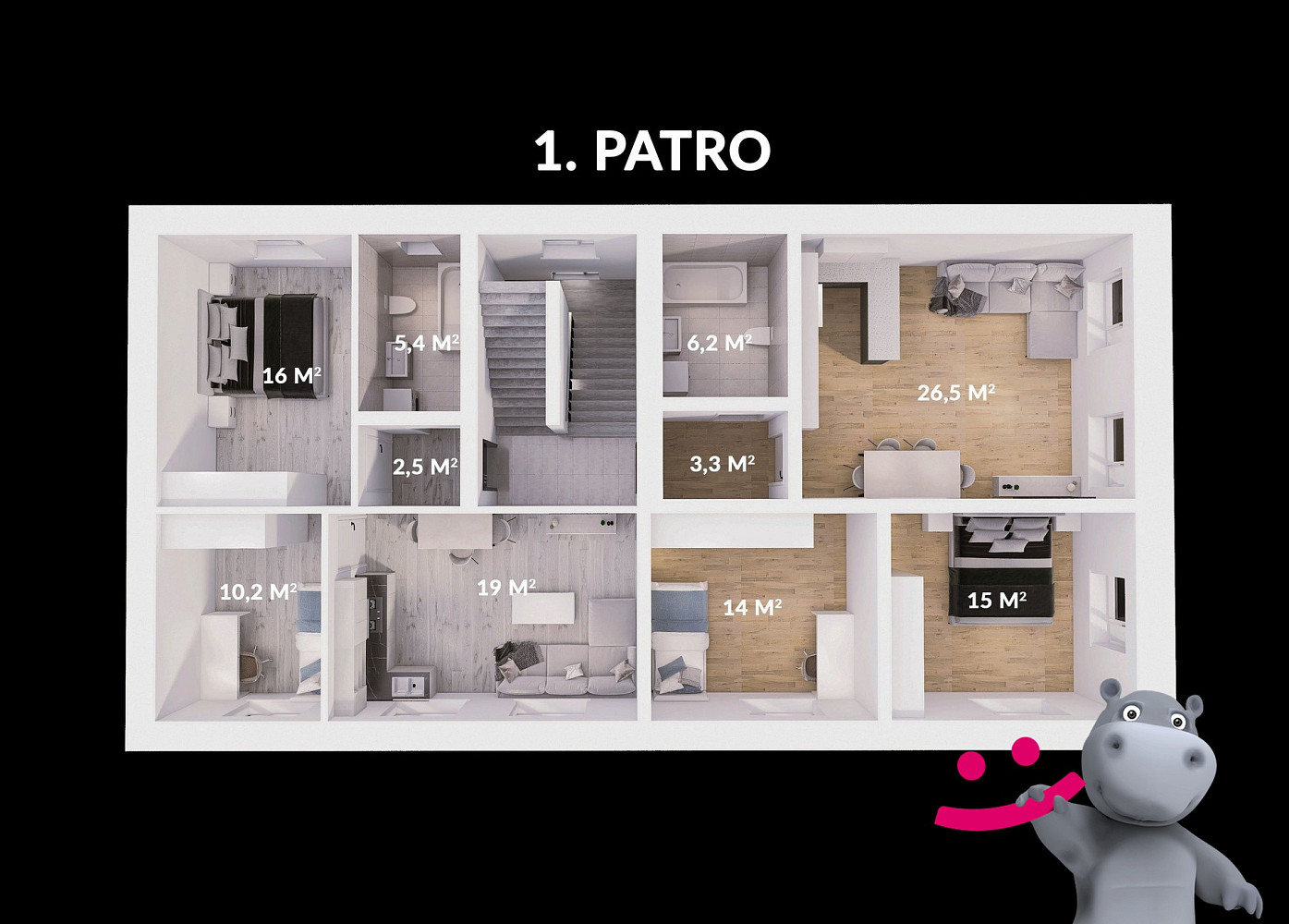 Rodinný dum před rekonstrukcí nabízí možností přestavby na bytový dům s 6ti bytovými jednotkami. Nebo 5ti byty a komerční plochou (obchod, kancelář, …). Viz ukázka možného řešení 3D: 1NP (20,6 m², 101,5 m²), 2NP: (53,1 m², 73,6 m²), 3NP (62,2 m², 74 m²), 4 garáže 71,2 m² a další parkovací stání.