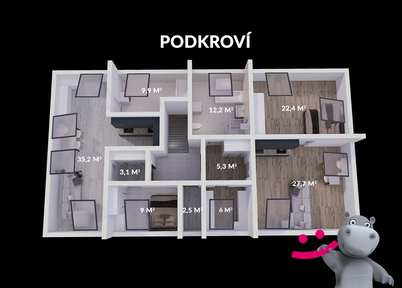 Výměry jsou pouze orientační. Rádi vám pošleme na vyžádání aktuální přesné zaměření (pasport): půdorysy, řezy, pohledy v pdf i dwg i nový geometrický plán.