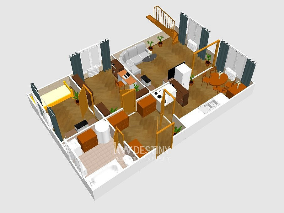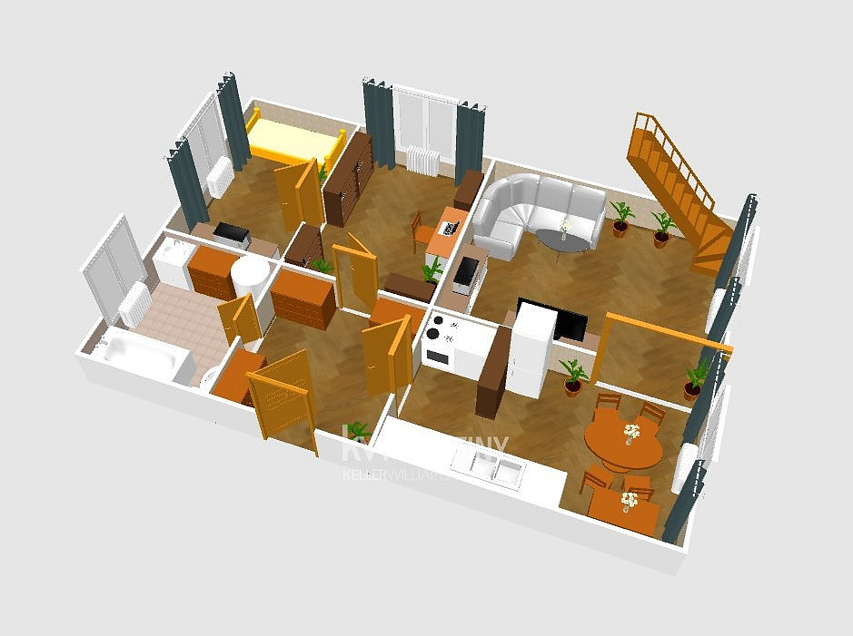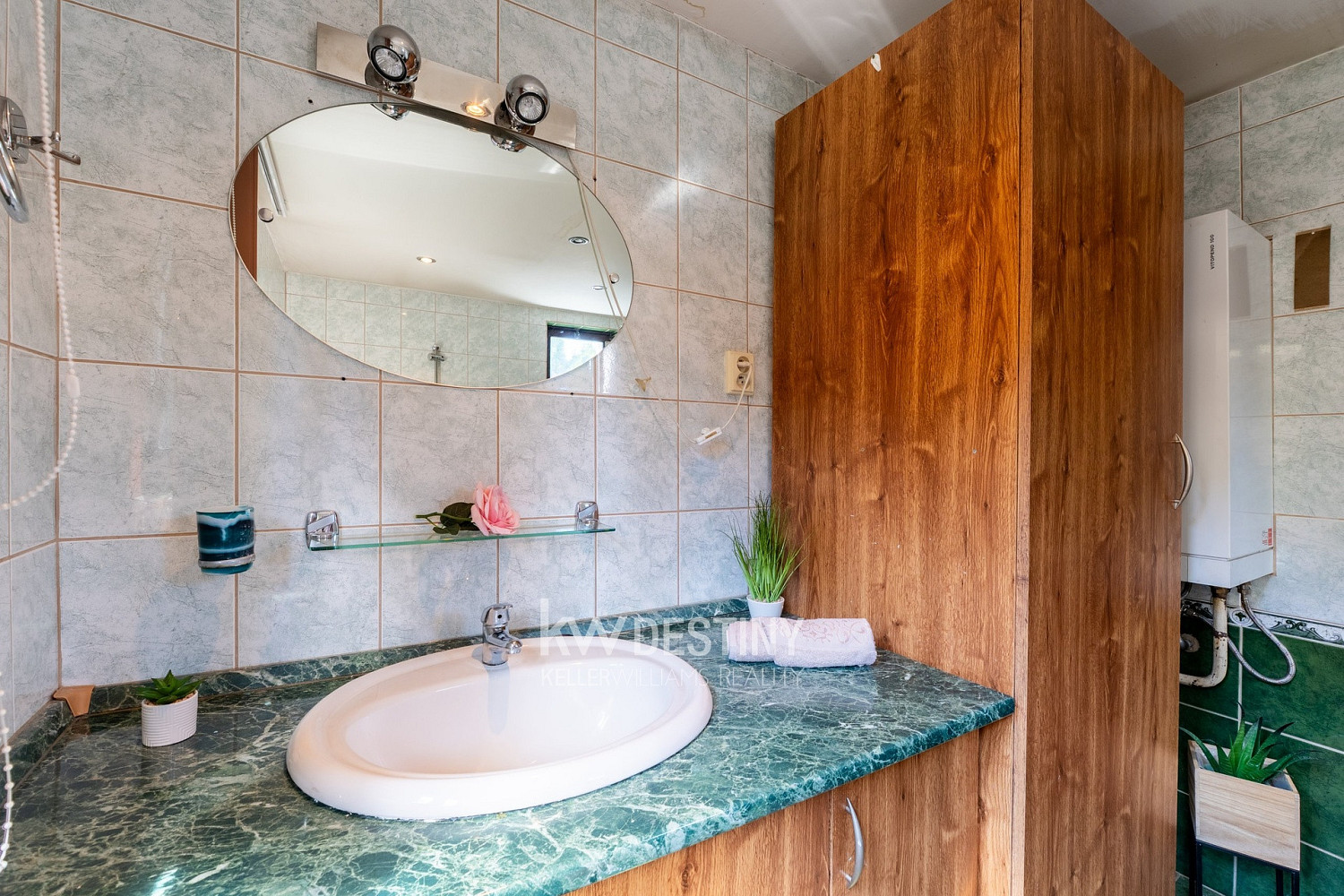 Dům je výborně dispozičně řešen. Z prostorné předsíně se vchází do koupelny s WC, do dvou pokojů a dále do kuchyně s obývacím pokojem a z toho potom ještě do podkrovního pokoje. Tím je zaručeno soukromí každému členovi domácnosti. Téměř ve všech místnostech je podlaha řešena z dřevěných parket. V předsíni a koupelně s WC je dlažba. O teplou vodu se taktéž stará taktéž plynový kotel. Jádro koupelny a WC je zděné. Kuchyňská linka s kombinovaným sporákem a jinými spotřebiči je stavěná na míru. V obývacím pokoji je dominantní pěkné dřevěné schodiště. Elektřina je v rozvedená po celém domě v mědi včetně nových jističů a proudovým chráničem.